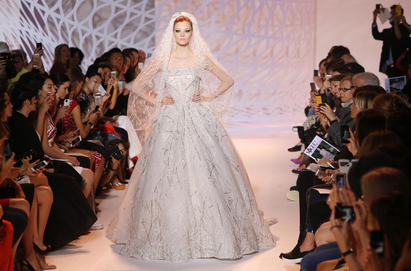 A model wears the wedding gown for Lebanese fashion designer Zuhair Murad's fall-winter 2014-2015 Haute Couture fashion colllection in Paris, France, Thursday, July 10, 2014. (AP Photo/Francois Mori)