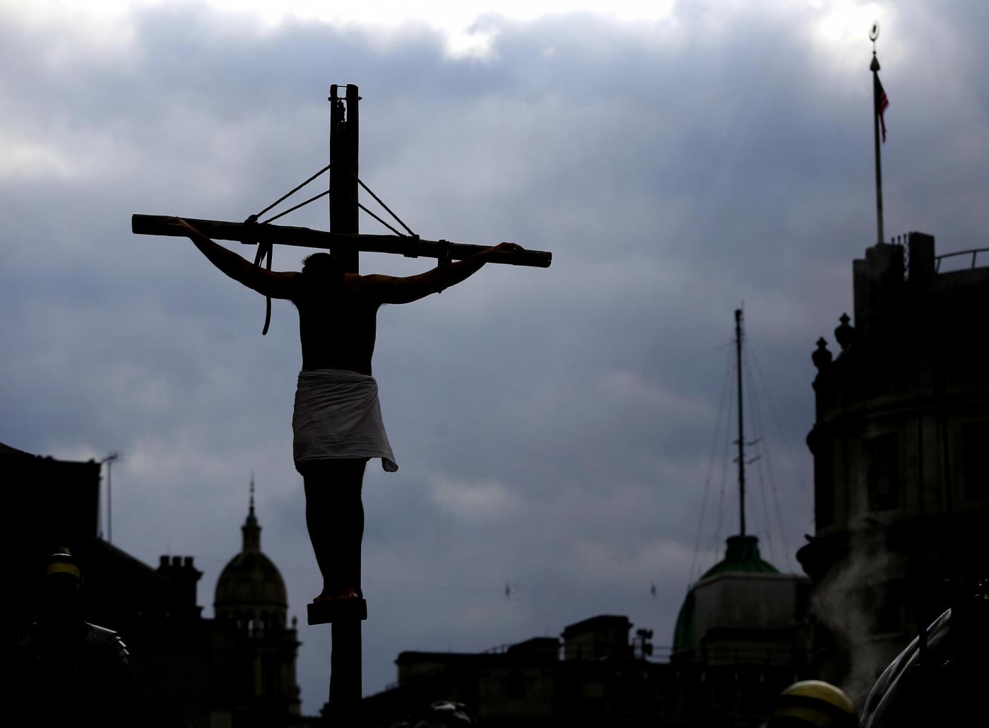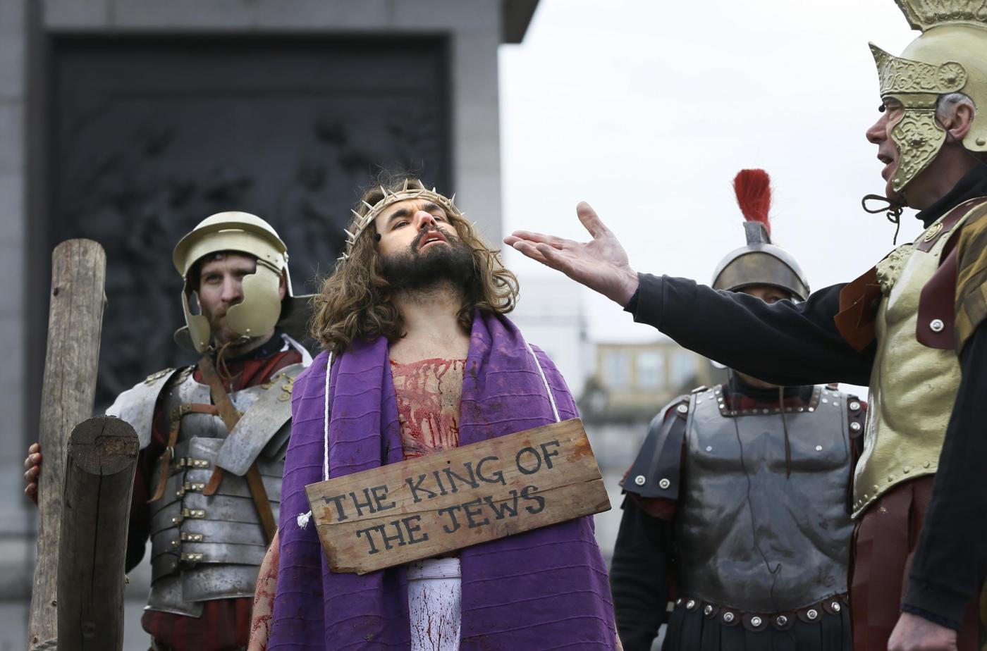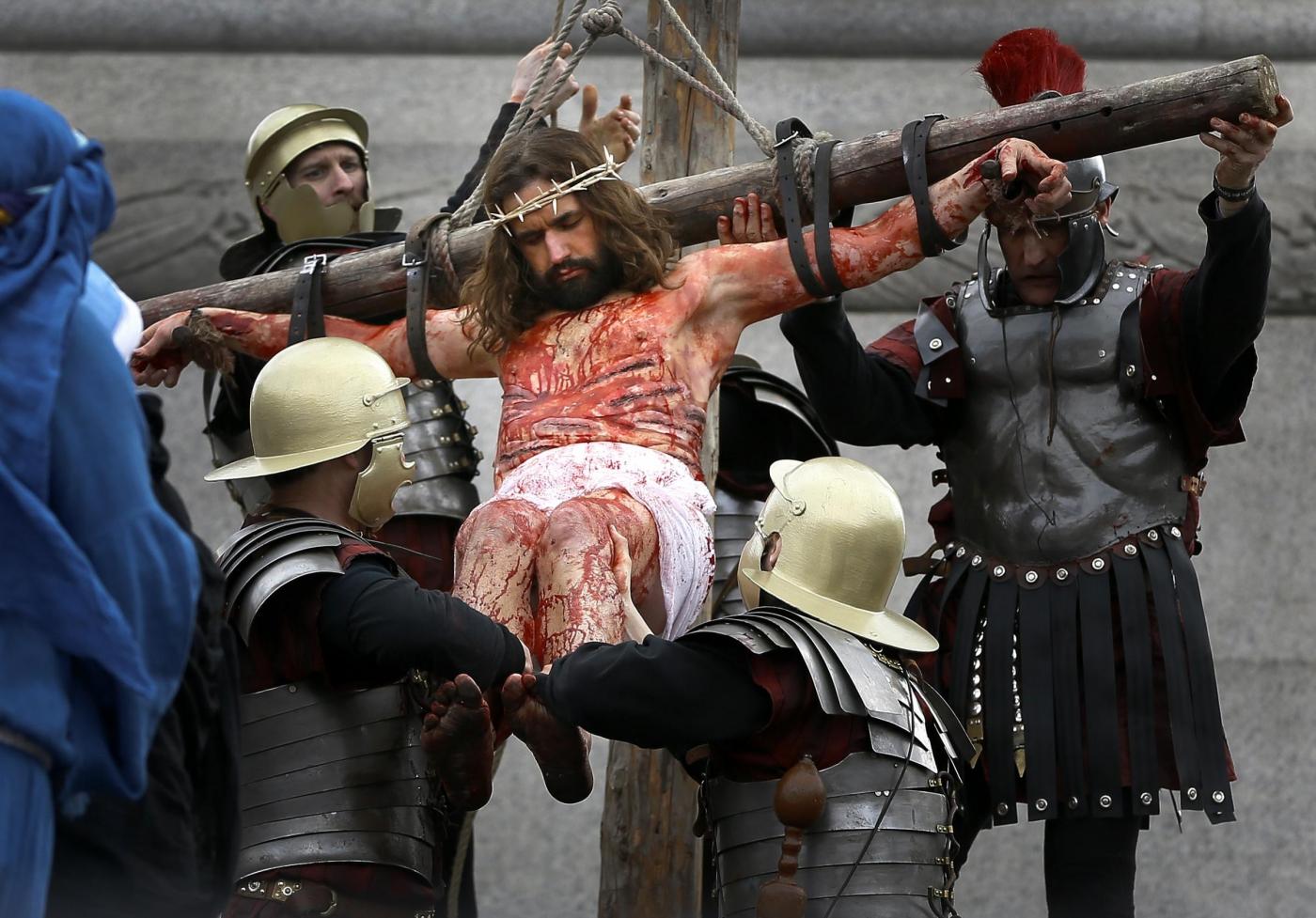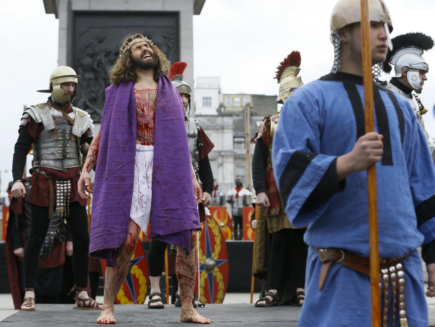 La raffigurazione messa in scena nella piazza londinese parte dal processo, fino alla crocifissione e alla resurrezione di Gesù (Ap/LaPresse)