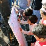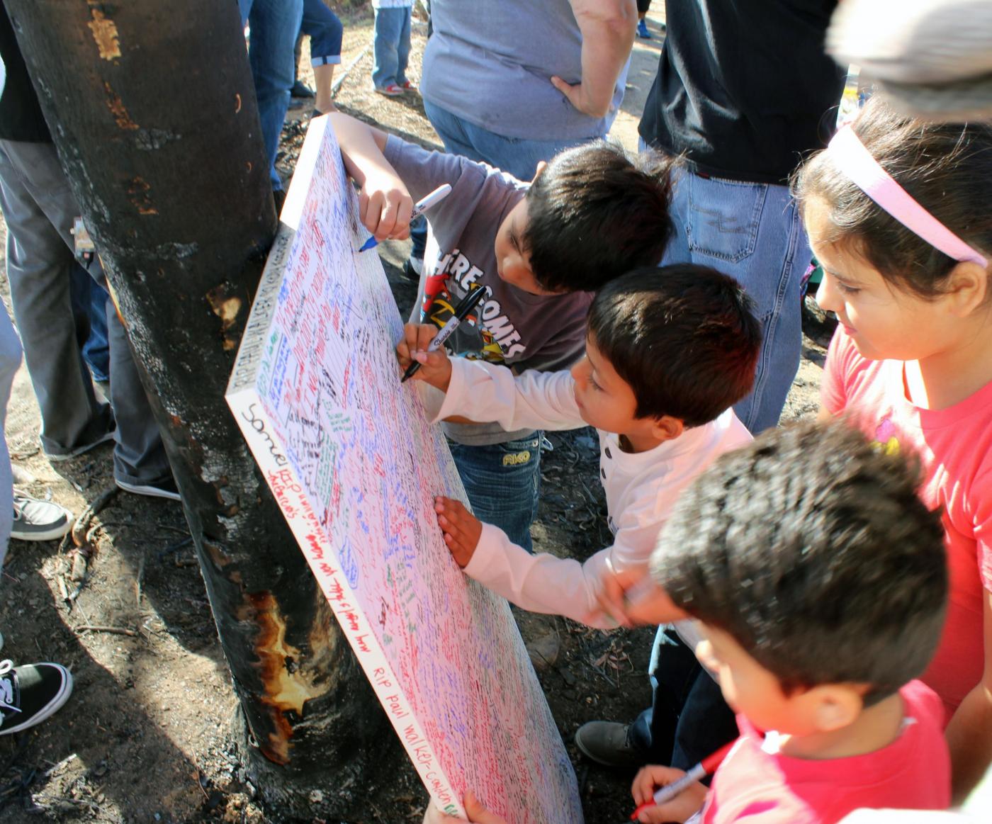 Children write messages on a canvas set against a burned tree trunk at the roadside memorial for actor Paul Walker in Valencia, Calif. on Sunday, Dec. 1, 2013. Walker is believed to have been a passenger in the car that crashed and burned on Saturday, Nov. 30, 2013 as a charity event at a nearby car shop was winding down.(AP Photo/The Santa Clarita Valley Signal, Ryan Fonseca)