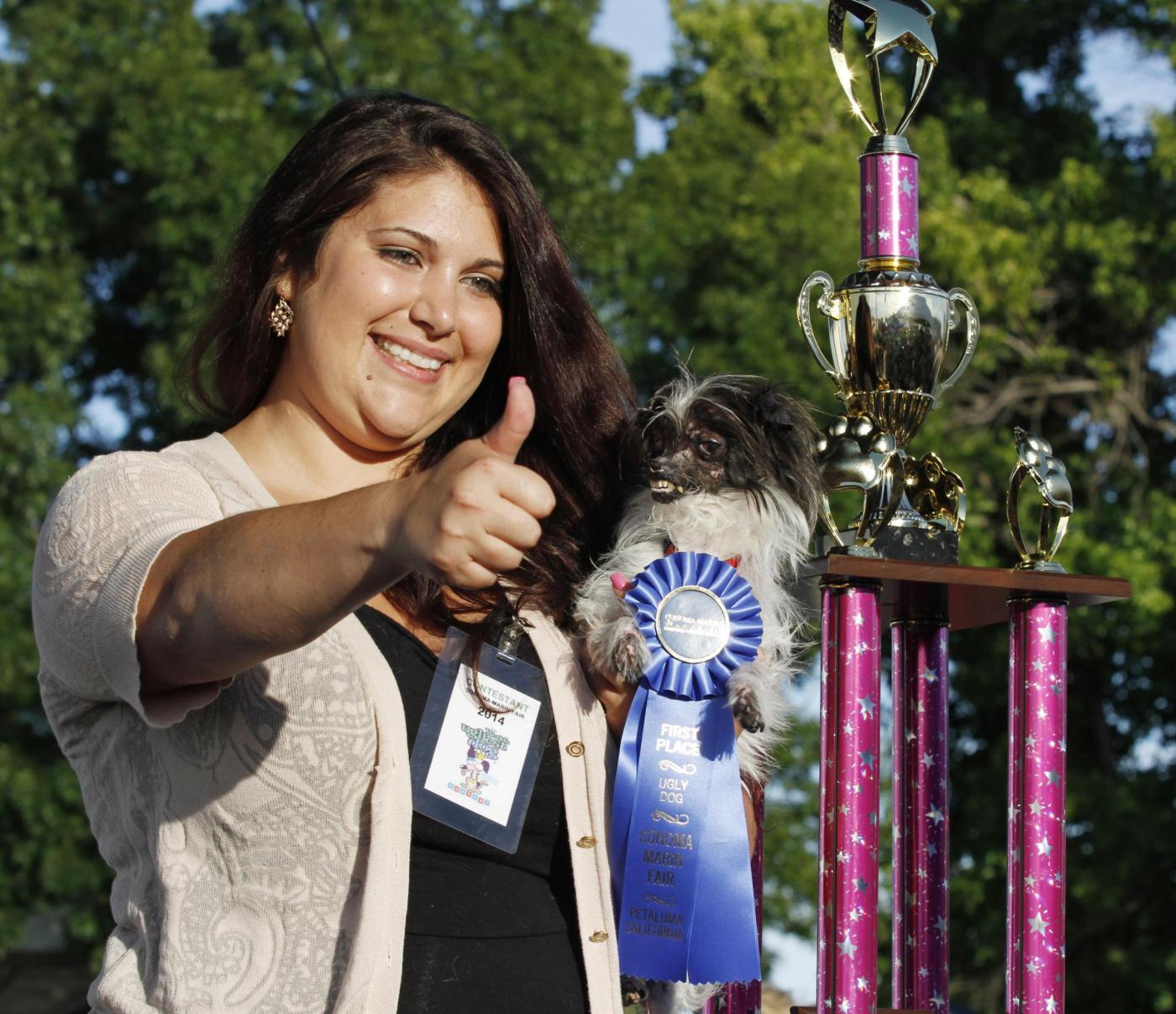 Peanut, a two-year-old mutt is held by Holly Chandler, after winning the World's Ugliest Dog Contest, at the Sonoma-Marin Fair, Friday, June 20, 2014, in Petaluma, Calif. Chandler and Peanut are from North carolina. (AP Photo/George Nikitin)