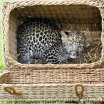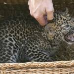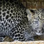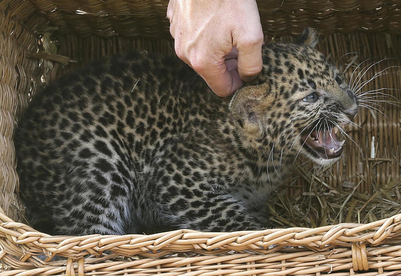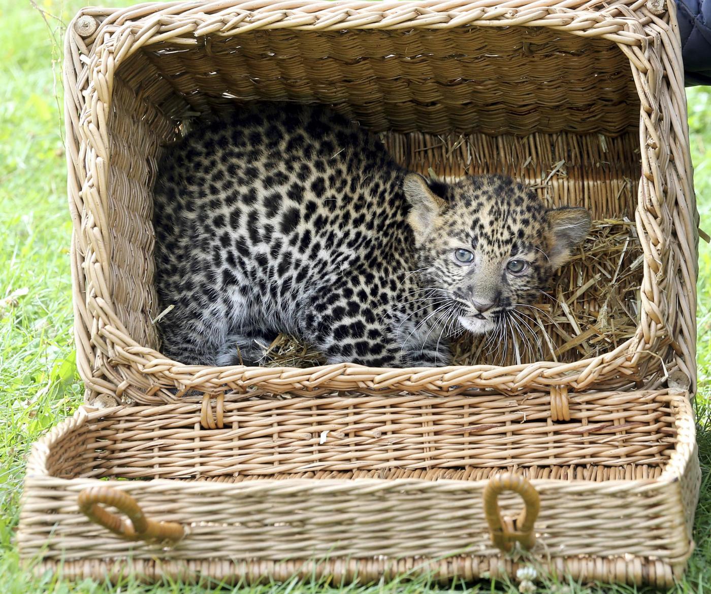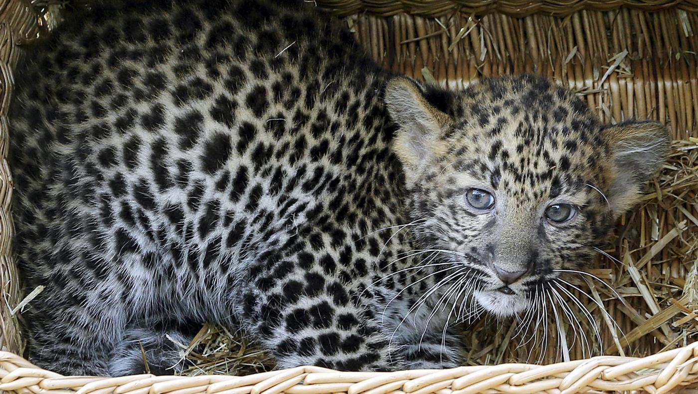 The newborn leopard cub Pelangi sits in a basket while shown for the first time after his birth on June 17, 2014 at the Zoo in Berlin, Friday Aug. 22, 2014. Pelangi weighs 2.8 kilogram.(AP Photo/dpa/Wolfgang Kumm)