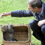 Zoo director Andreas Knieriem plays with newborn leopard cub Pelangi who was born on June 17, 2014 at the Zoo in Berlin, Friday Aug. 22, 2014. Pelangi weighs 2.8 kilogram.(AP Photo/dpa/Wolfgang Kumm)