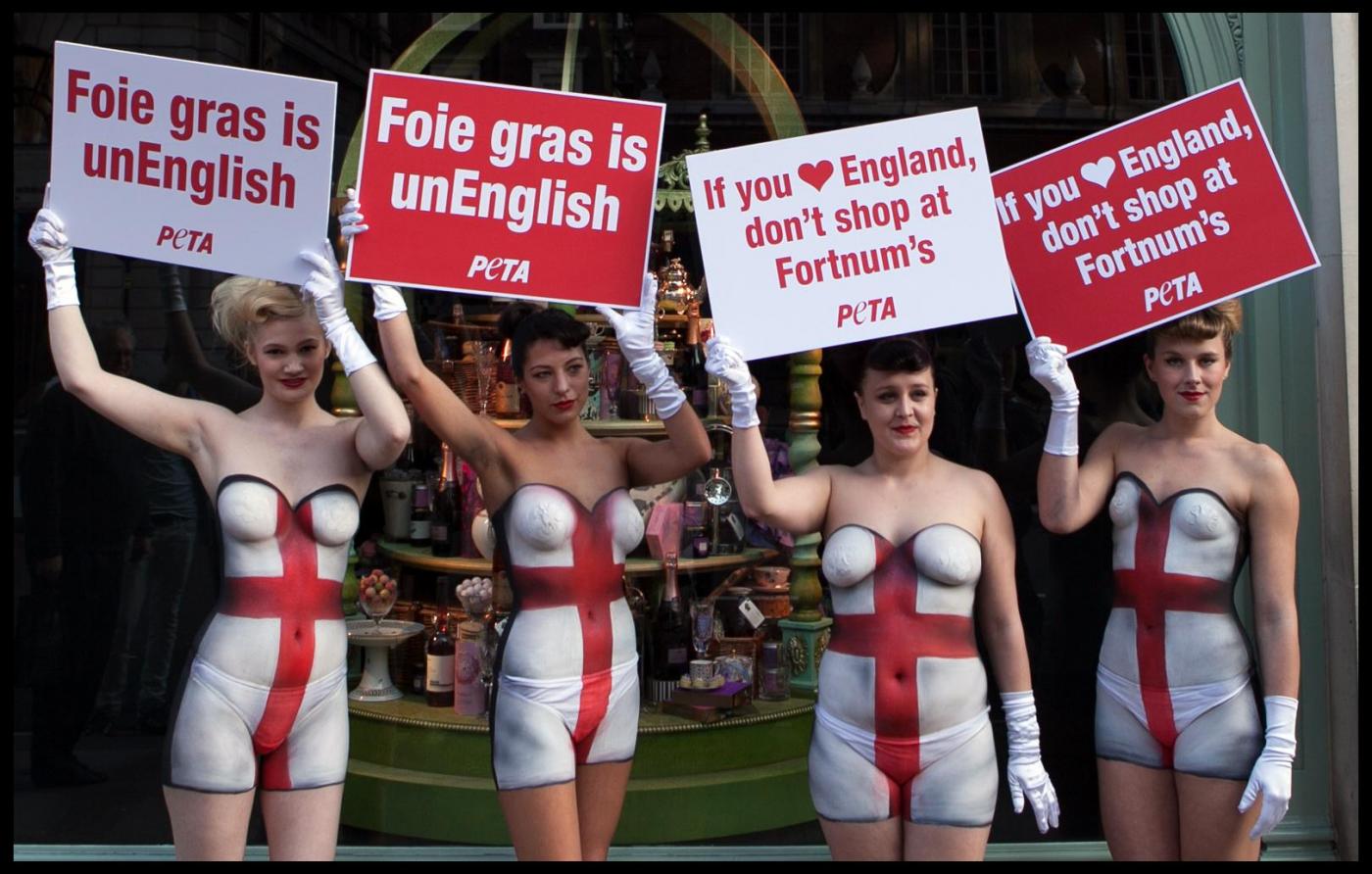 April 23, 2013 - London, UK - PETA activists painted with St George's flags and holding signs reading 'Fois Gras in UnEnglish' protest outside Fortnum & Mason St George's Day event. PETA's Mimi Bekhechi says: 'Marketing your wares on your English heritage and then selling a product that's illegal to produce in the UK because it's the result of animal abuse is both cruel and the height of hypocrisy'. London, UK, Tuesday, April 23, 2013. LaPresseOnly Italy