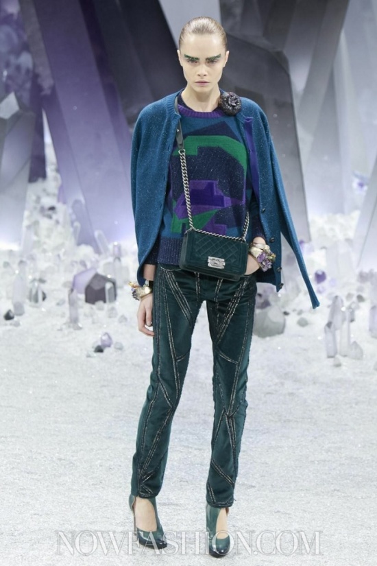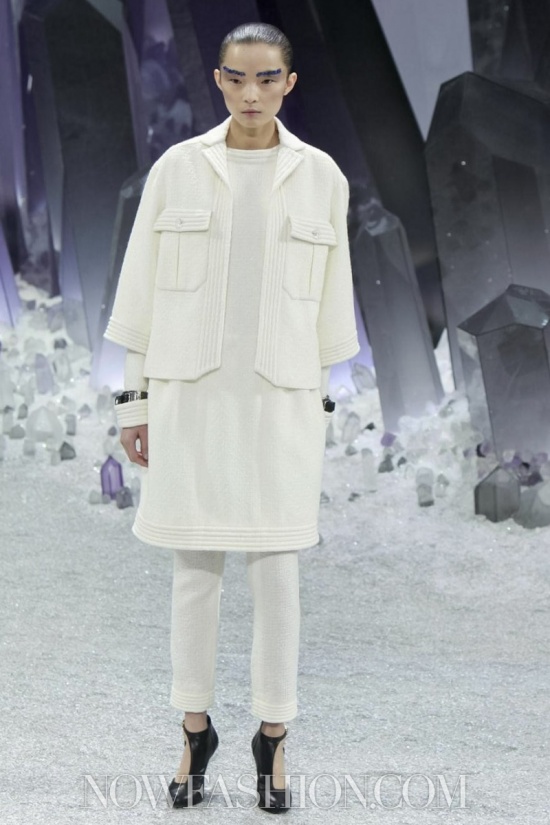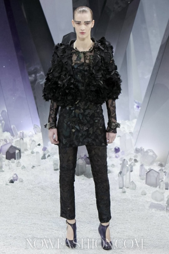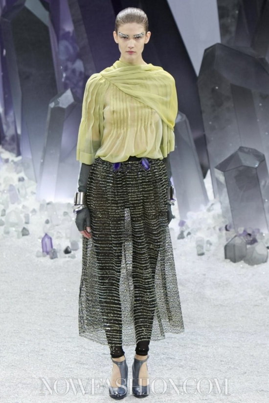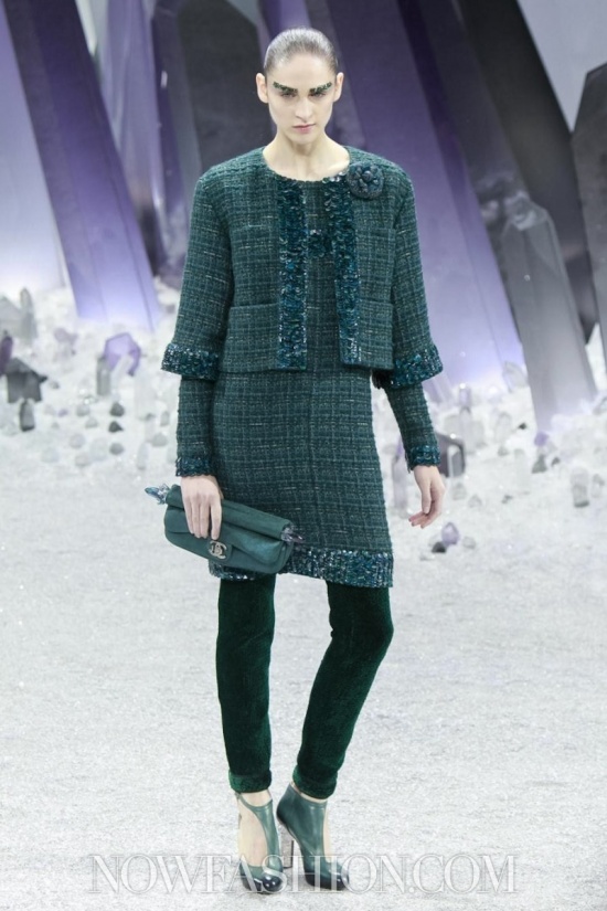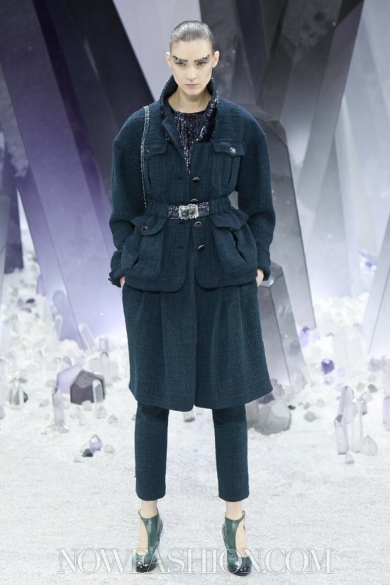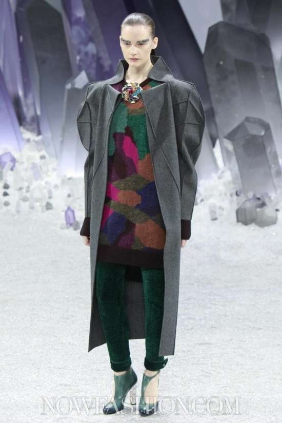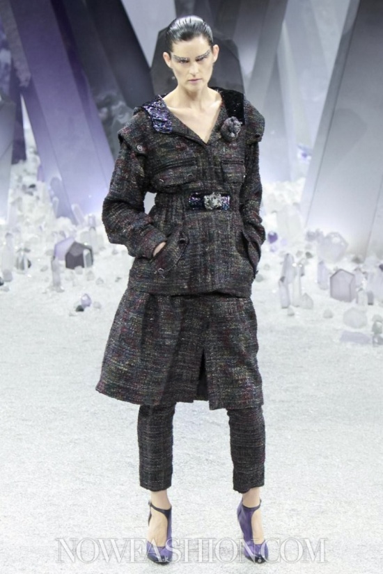 Ma incominciamo dalla scenografia, che da Chanel conta sempre molto. Stavolta, sotto la cupola di vetro del Grand Palais, duemila persone erano accomodate intorno a una maestosa ricostruzione di un fantastico mondo minerale, pieno di cristalli appuntiti e luccicanti che doveva trasmettere la sensazione di un ‘Viaggio al centro della terra’. Ambiente quanto mai adatto alla collezione, e lo si è visto subito. Tutto il tweed di Chanel è diventato metallico, le lane bouclé sembrano ematite e pirite, il lurex ha i luccichii della polvere di ferro. Tacchi alti e trasparenti come cristallo, coronati da grovigli di quarzo, accompagnano i tailleur con la gonna arricciata e il cappotto che, con un gioco di zip, diventa una tuta, da indossare sempre con sottostanti calzoni. Sulle maniche del robe manteau sono applicati tasselli come facce di un prisma, su quelle dell’abito una cascata di quarzi grigi e rosa.