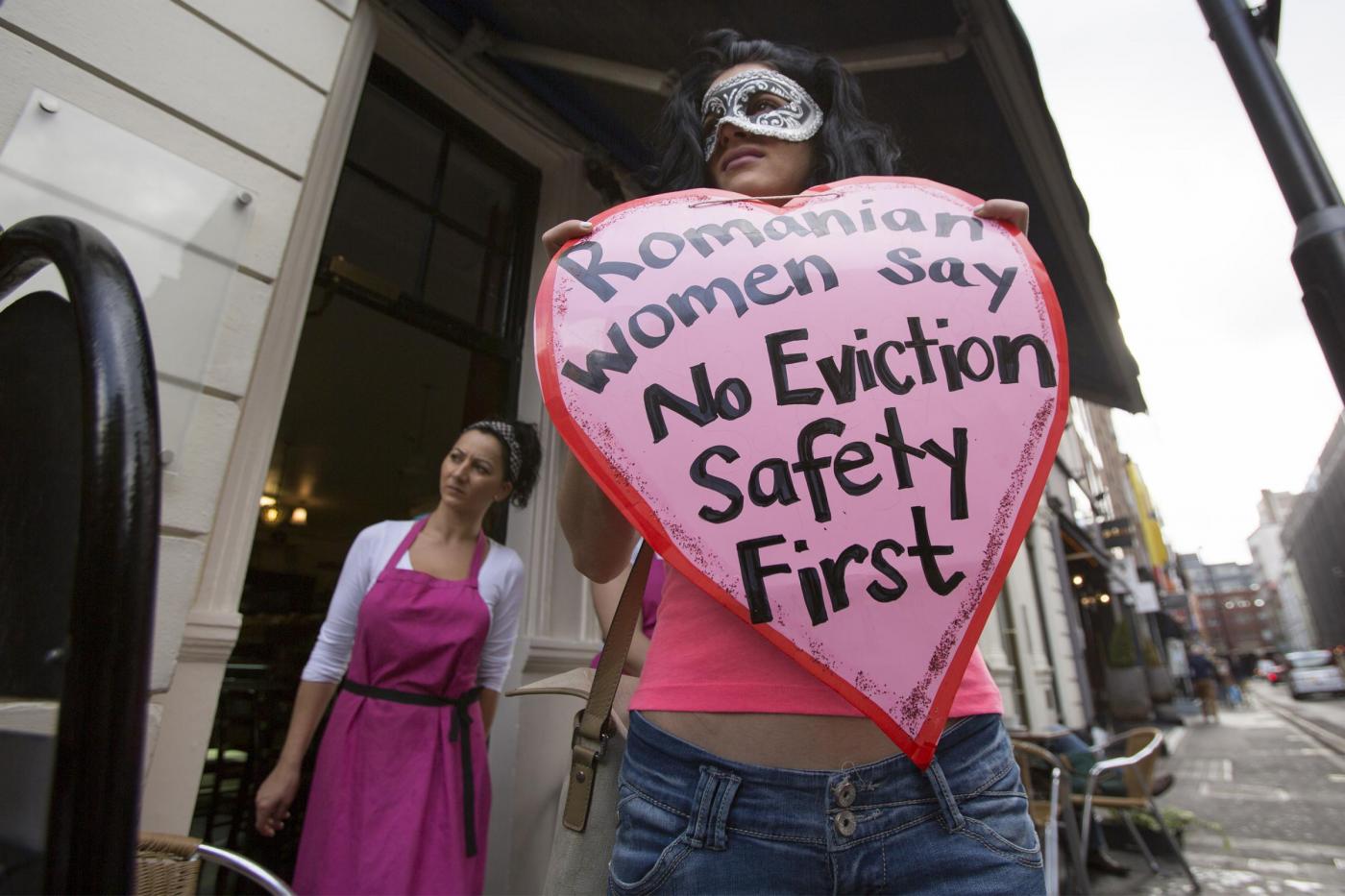 Oct. 9, 2013 - An activist handing out leaflets to protest against evictions of sex workers and the changes being made in Soho by hotel and restaurant developers. Photo credit: Tolga Akmen/LNP. LaPresseOnly Italy