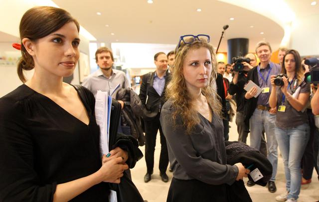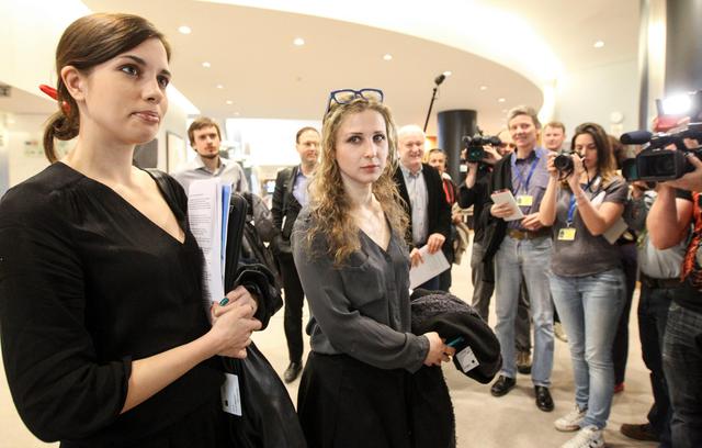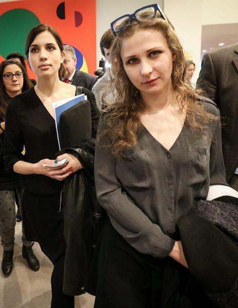 epa04149303 Nadeschda Tolokonnikowa (L) and Maria Aljochina (R) of the Russian punk band Pussy Riot arrive at a hearing by Green group on Russia and human rights at the EU parliament in Brussels, Belgium, 01 April 2014. EPA/OLIVIER HOSLET