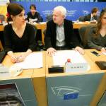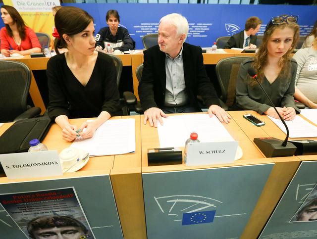 epa04149299 Nadeschda Tolokonnikowa (L) and Maria Aljochina (R) of the Russian punk band Pussy Riot sit with German green MEP Werner Schulz (C), during a hearing by Green group on Russia and human rights at the EU parliament in Brussels, Belgium, 01 April 2014. EPA/OLIVIER HOSLET