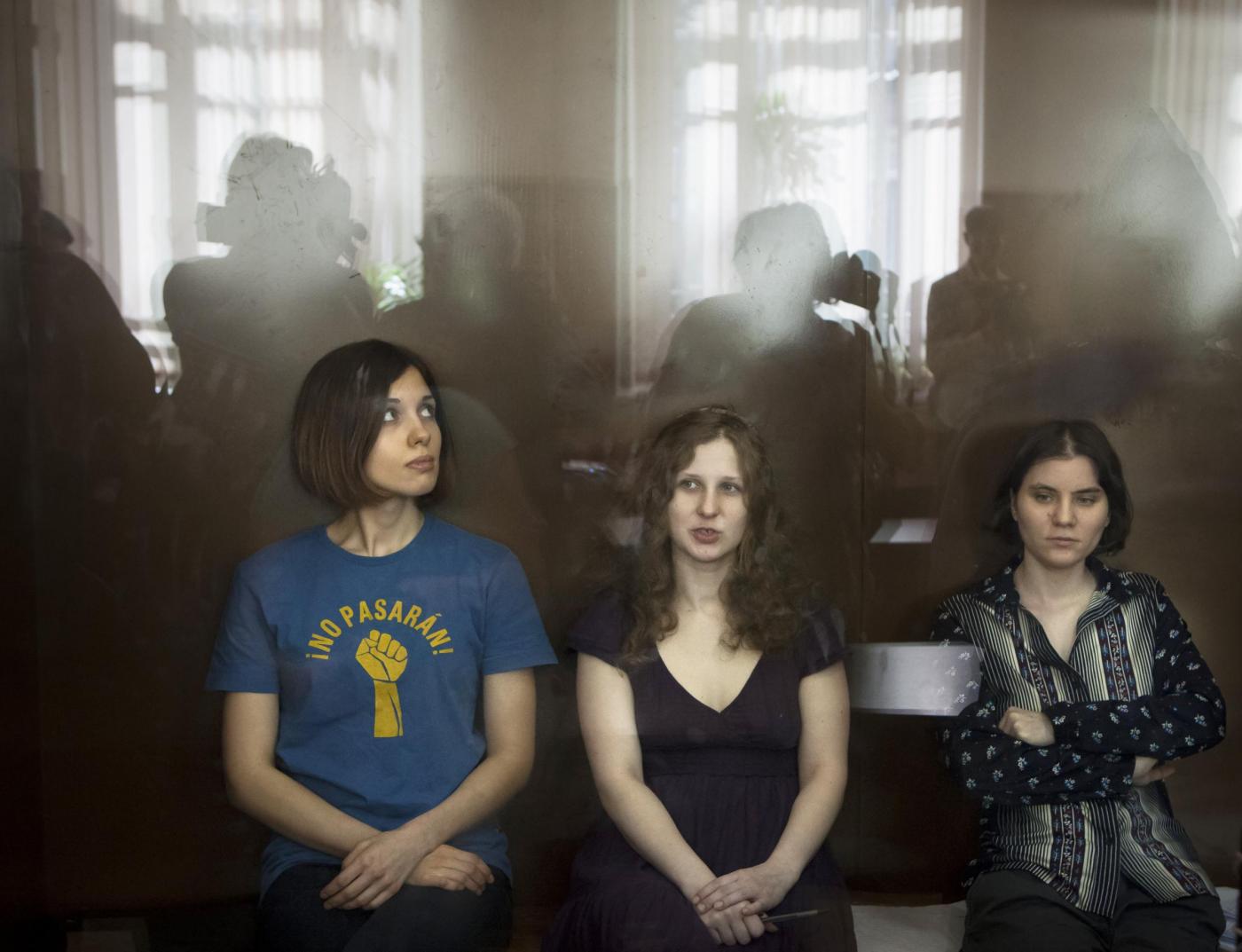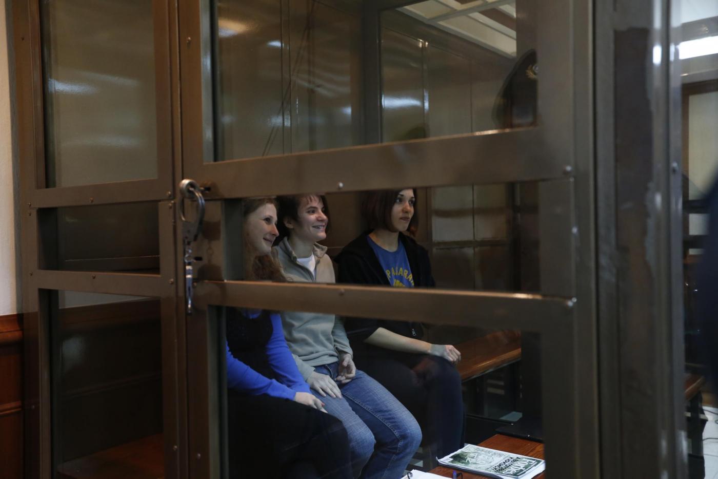 Feminist punk group Pussy Riot members, from left, Maria Alekhina, Yekaterina Samutsevich and Nadezhda Tolokonnikova sit in a glass cage at a court room in Moscow, Russia on Monday Oct. 1, 2012. A Russian court is set to hear an appeal filed by three jailed members of the rock band Pussy Riot, who have been sentenced to two years for performing a "punk prayer" against President Vladimir Putin at Moscow's main cathedral. (AP Photo/Sergey Ponomarev)