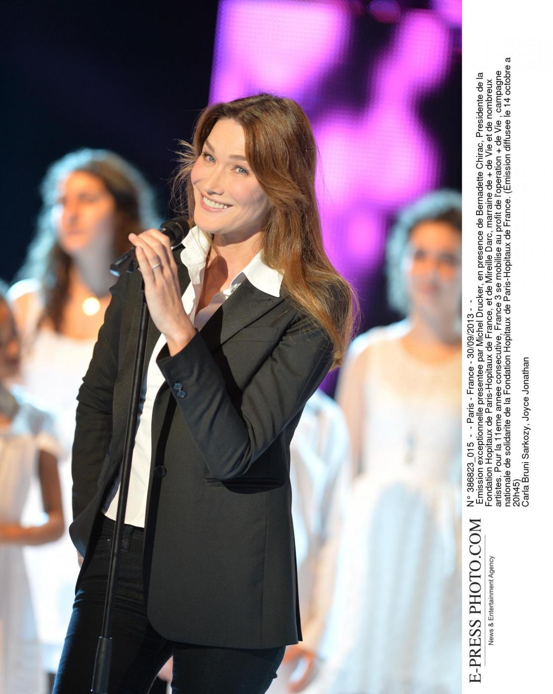 Emission exceptionnelle presentee par Michel Drucker, en presence de Bernadette Chirac, Presidente de la Fondation Hopitaux de Paris-Hopitaux de France, et de Mireille Darc, marraine de + de Vie et de nombreux artistes. Pour la 11eme annee consecutive, France 3 se mobilise au profit de l'operation + de Vie, campagne nationale de solidarite de la Fondation Hopitaux de Paris-Hopitaux de France. (Emission diffusee le 14 octobre a 20h45) Laresse Only italyCarla Bruni Sarkozy;Joyce Jonathan