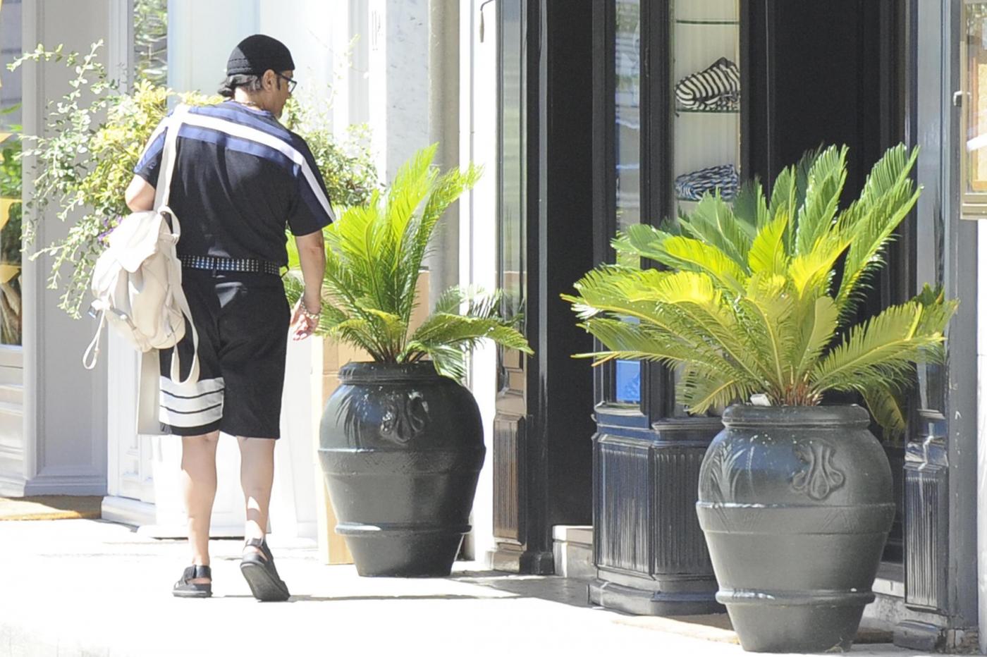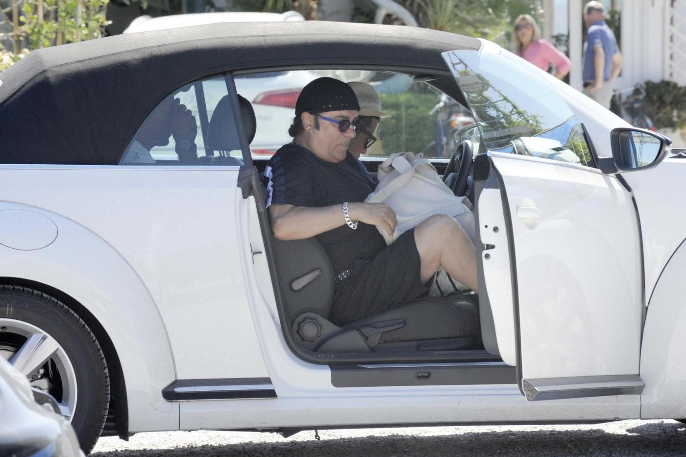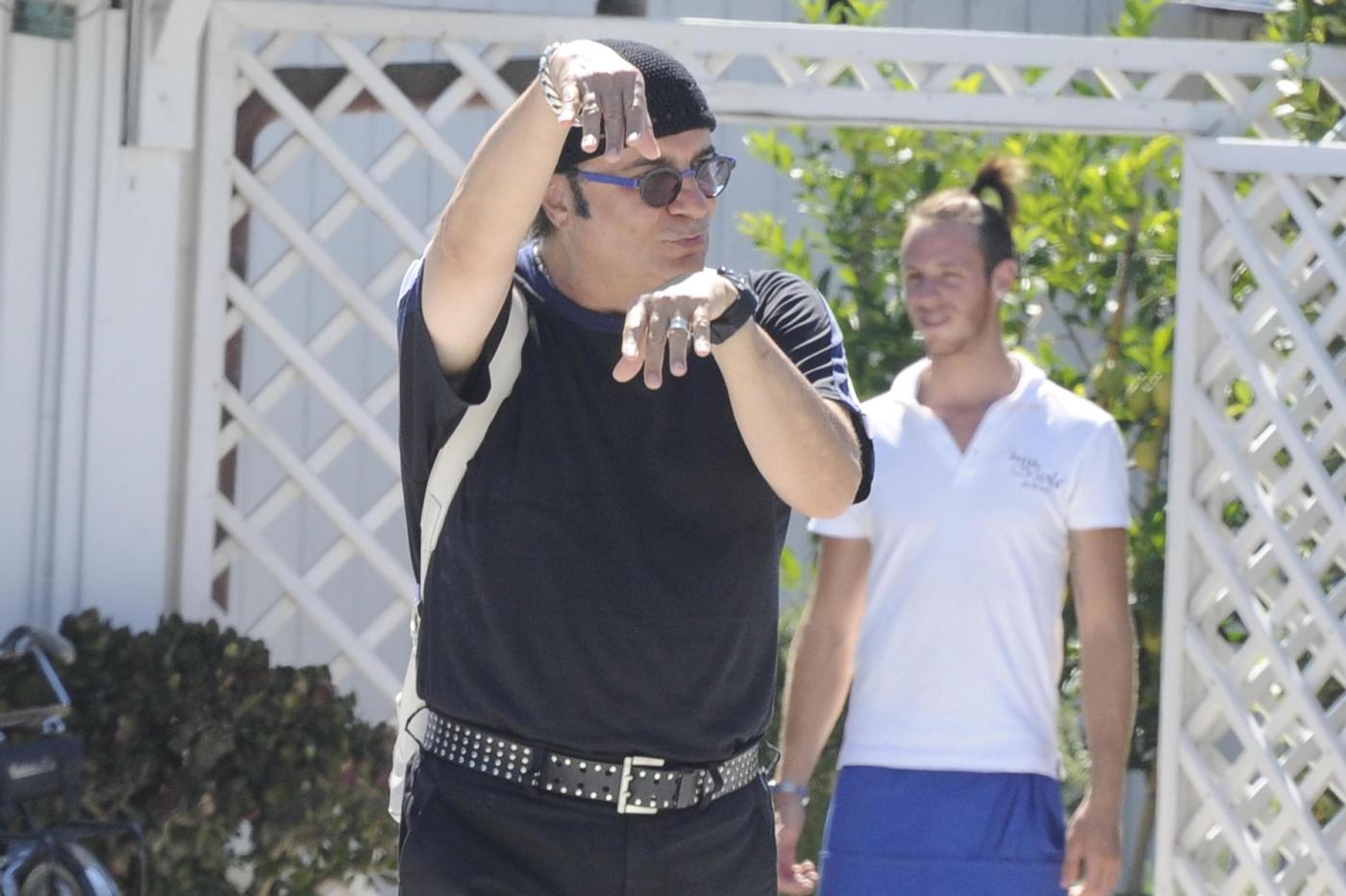 Sempre fuori dagli schemi il cantautore italiano: nella località balneare toscana si presenta in sandali, bandana e cinturone borchiato e sempbra un po’ infastidito dalla presenza dei fotografi.