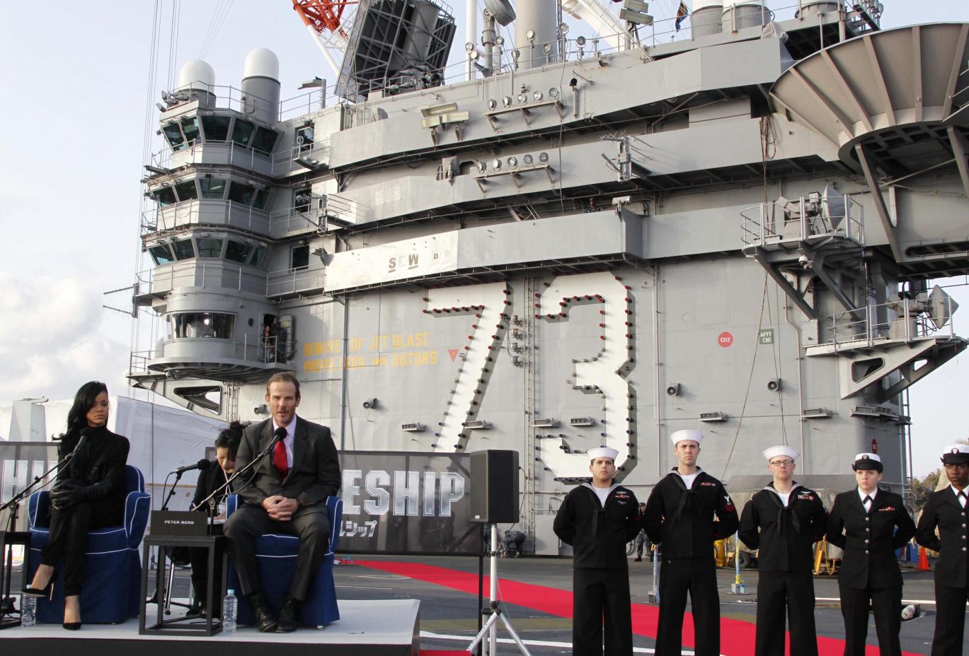 TOKYO – Le stelle del film fantascientifico ‘Battleship’ si sono riunite per una conferenza stampa a bordo della portaerei USS George Washington, un giorno prima del debutto mondiale che si terrà a Tokyo. Il film, diretto da Peter Berg, annovera nel suo un cast anche la pop star Rihanna che ha recitato al fianco di Brooklyn Decker, Alexander Skarsgard e Taylor Kitsch, oltre all’attore giapponese Tadanobu Asano.