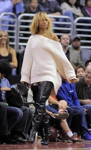 Rihanna continua a far parlare di se. Dopo svariate foto in bikini “succinti” e pose sexy mentre fa fitness, e dopo vari outfit non proprio riusciti, eccola di nuovo che ci sorprende. Questa volta si è presentata ad una partita allo Staples Centerdei Denver Nuggets VS Los Angeles Clippers niente meno che con una chioma… biondissima e liscia. E purtroppo questa volta non si tratta di una parrucca, come quella usata per la pubblicità di Emporio Armani qualche tempo fa, ma di un ennesimo cambio radicale di capelli passando dai suo ricci e castani ad un biondo pagliericcio e stirato con frangia.