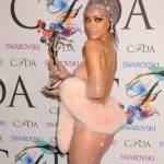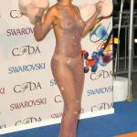 Ha sfilato pressoché nuda: un abito leggerissimo, trasparente, ricoperto di delicati cristalli swaroski. Aderente, scollatissimo, sia davanti che dietro. Soprattutto, lasciava intravedere tutta la bellezza della cantante, orgogliosamente senza reggiseno, con un ridottissimo perizoma color nudo come unica biancheria intima.