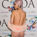 Sembra impossibile dirlo, ma risulta un look elegante: la cuffia e la stola di pelliccia color cipria danno al look una “allure” anni Venti, Rihanna porta il tutto con garbo e con quel fisico può davvero concedersi tutto.