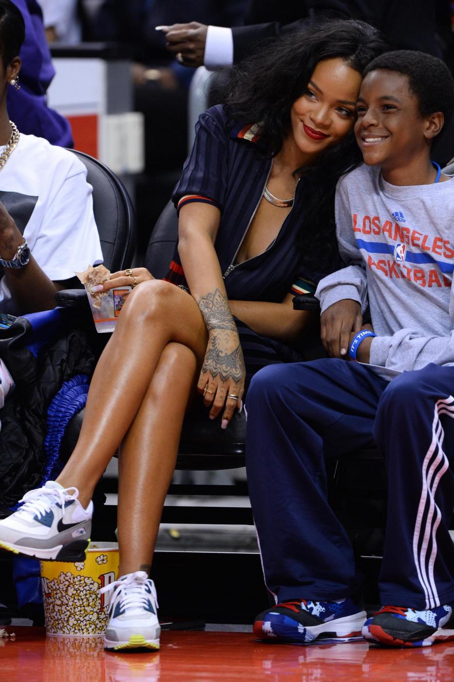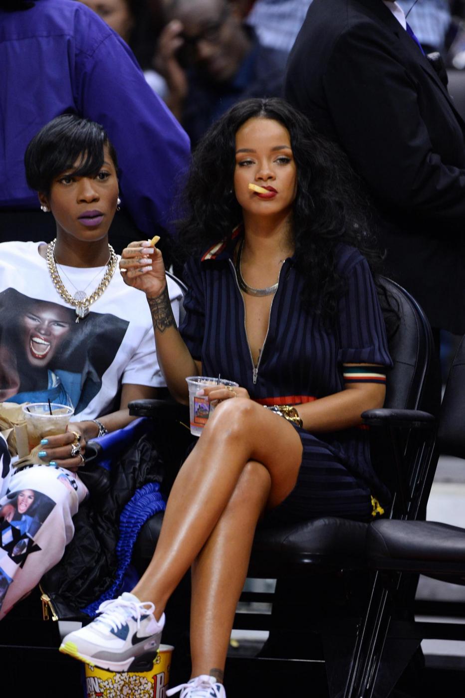 La cantante delle Barbados, a bordo campo sfoggia una generosa scollatura e assiste al match tra risate ritocchi al trucco e abbuffate di patatine fritte. Oltre alla cantante di Barbados, allo stadio c’è anche Drake, salutato durante la partita da un giocatore (foto Ap/LaPresse)