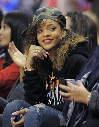 LOS ANGELES – Cappellino da baseball, jeans strappati e felpa oversize. Per andare a vedere la partita tra Miami Hit e Los Angeles Clippers, a Los Angeles, Rihanna ha recuperato lo stile street-style. Insieme ad alcuni amici la cantante non ha rinunciato però ad un tocco di femminilità: rossetto rosso fuoco e manicure curatissima. (Foto Lapresse).