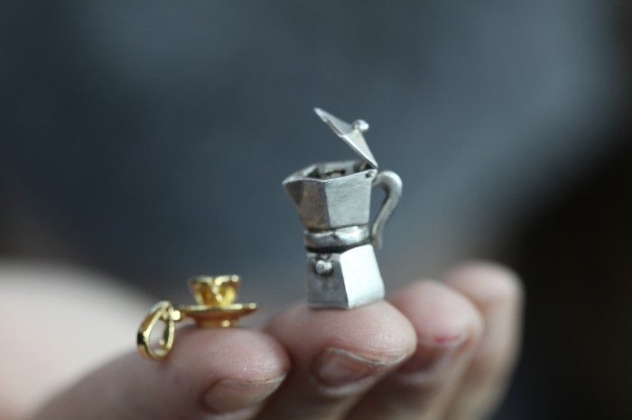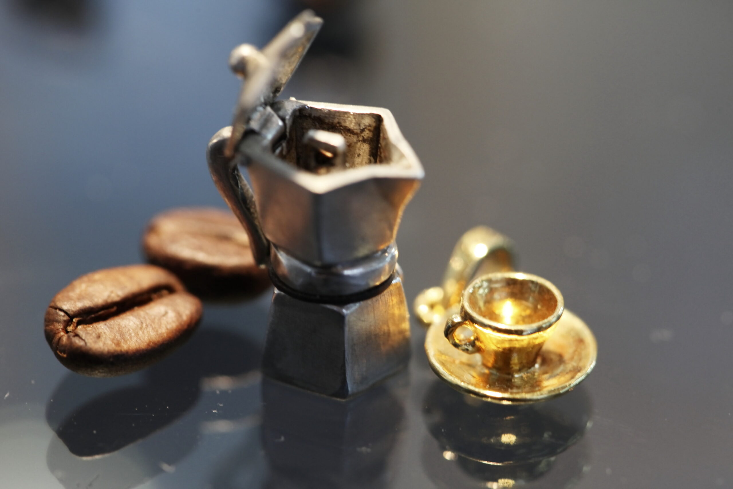 La mini moka è opera di Pietro Marmo, pavese, orafo dall’età di 15 anni che, da qualche anno, ha iniziato a lavorare nel settore del caffè. “Mi sono accorto che mancavano opere di oreficeria nel settore e ho iniziato a realizzarle io”, racconta. Ecco allora i primi chicchi d’oro e diamanti, i braccialetti e i ciondoli a tema. È subito un successo. Tra le opere dell’artigiano è da segnalare anche la Collezione Pedrocchi, realizzata ad hoc per l’omonimo storico caffè padovano per i 150 anni dell’Unità d’Italia e i 180 anni del Caffè.