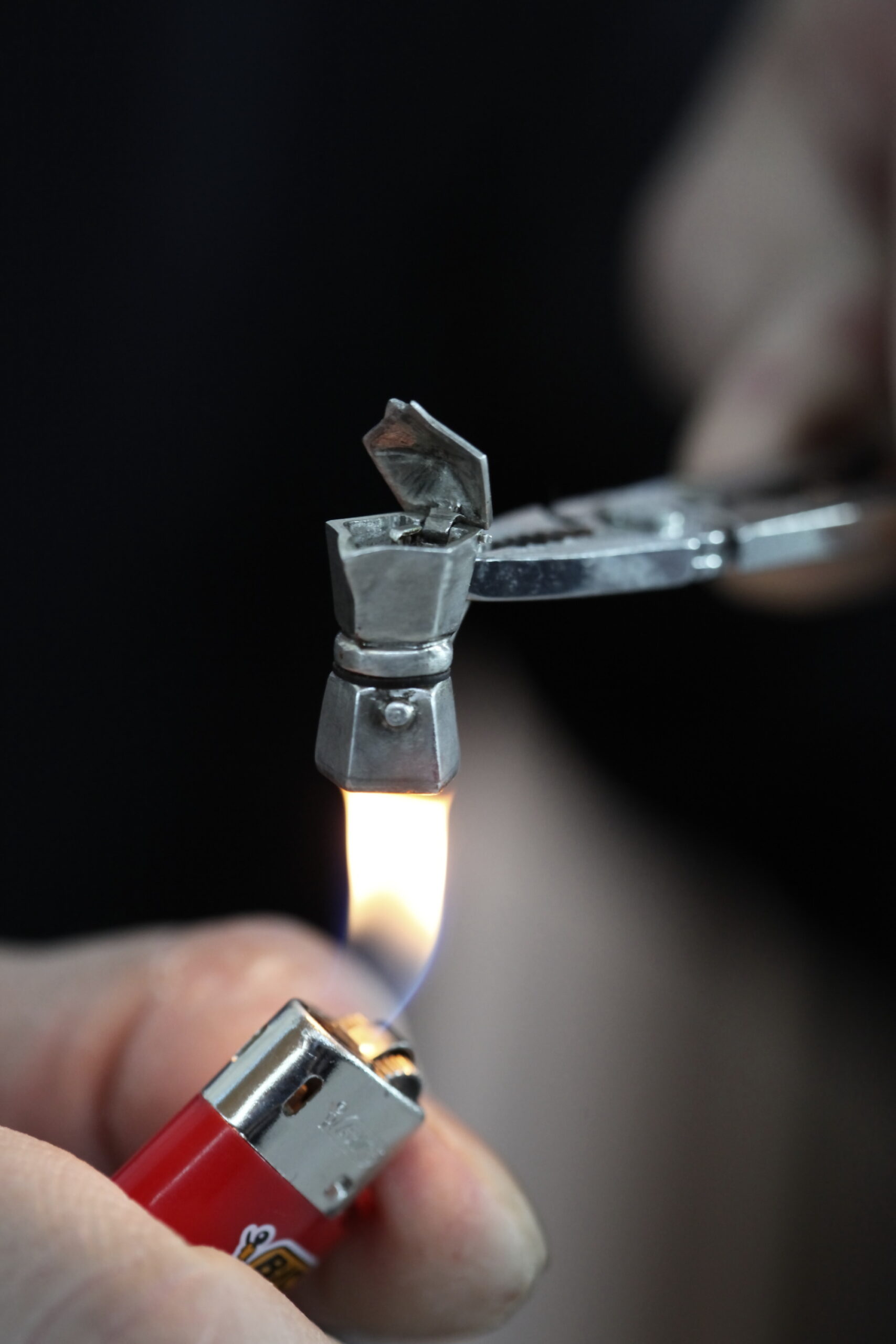 Dopo il cioccolatino più grande del mondo ecco la caffettiera più piccola del mondo: 19 millimetri di altezza e divisibile in 5 pezzi come una qualsiasi moka. Bastano 10 gocce d’acqua che s’inseriscono con una siringa nell’apposito bollitore e pochi granelli di caffè macinato. Si chiude il tutto, si prende un accendino e in 25 secondi il caffè più ristretto del pianeta è pronto. Da versare, naturalmente, nell’apposita mini tazzina.
