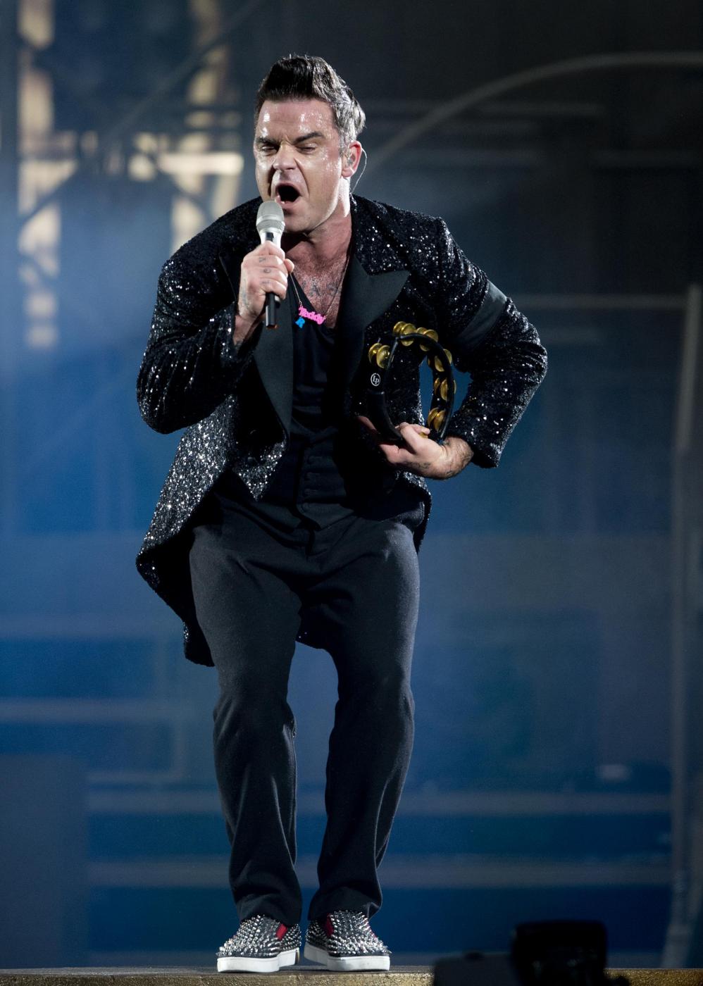 British singer Robbie Williams performs during the 65th Bambi media award ceremony at the Stage Theater in Berlin, Germany, 14 November 2013. (AP Photo/dpa, Michael Kappeler)