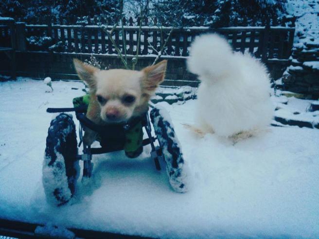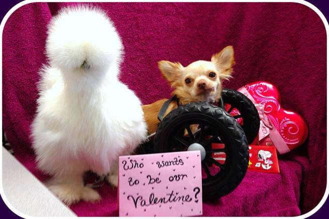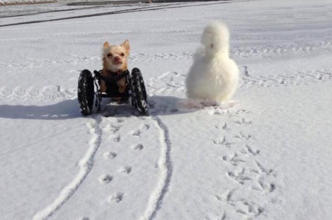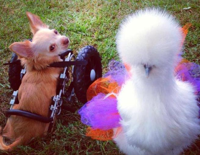 Penny invece, è un pollo silkie ed è stato invece portato via da un laboratorio che altrimenti lo avrebbe utilizzato come cavia. I due animali diversissimi fra loro sono diventati amici inseparabili: l’ospedale per animali che li ospita ha così deciso di pubblicare le loro buffonate sulla pagina di Facebook. Roo si muove grazie a delle rotelle speciali applicate al posto delle zampe posteriori.