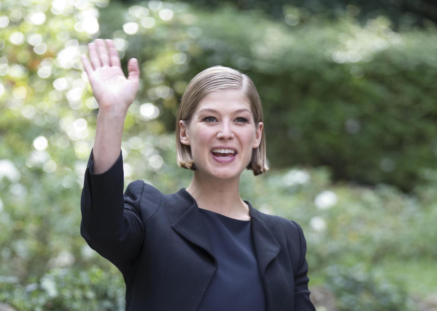 Actress Rosamund Pike waves as she arrives for the photo call of her movie "Gone Girl", in Rome, Friday, Sept. 12, 2014. (AP Photo/Alessandra Tarantino)