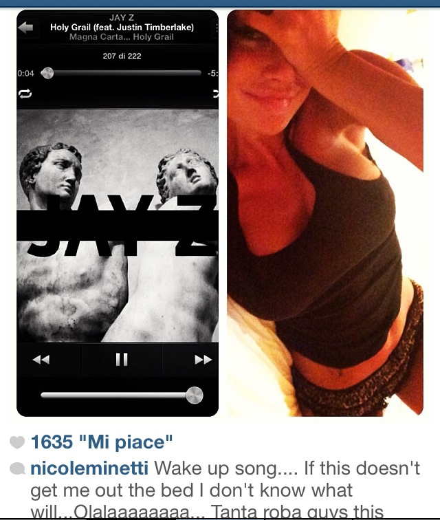 Lo scatto di questa mattina riprende l’ex igienista dentale dall’alto: fisico mozzafiato e scollatura, Nicole sembra tranquilla e serena come sempre. Come mostra nella foto, ascolta Justin Timberlake e saluta i suoi fan: “Wake up song… If this doesn’t get me out the bed I don’t know what will… Olalaaaaaaa… Tanta roba guys this album” scrive euforica Nicole Minetti.