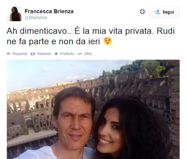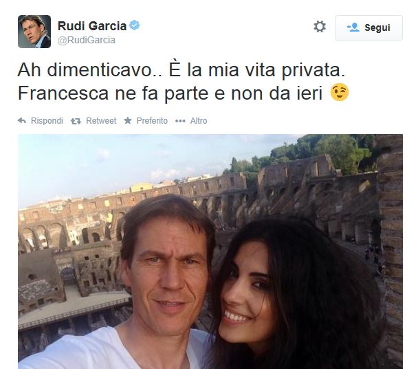 ROMA – Rudi Garcia è innamorato: la donna che ha rapito il suo cuore è Francesca Brienza, volto noto del canale Roma Tv, estremamente tifosa della squadra di calcio capitolina. Ad ufficializzare la relazione è stato lo stesso allenatore della Roma attraverso un tweet con scritto: “Ah dimenticavo.. È la mia vita privata. Francesca ne fa parte e non da ieri”.