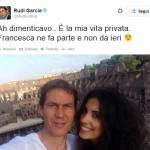 E stessa cosa ha fatto lei sul suo profilo scrivendo: “Ah dimenticavo.. È la mia vita privata. Rudi ne fa parte e non da ieri”. Entrambi i cinguettii sono accompagnati da una selfie in cui la coppia appare all’interno del Colosseo.