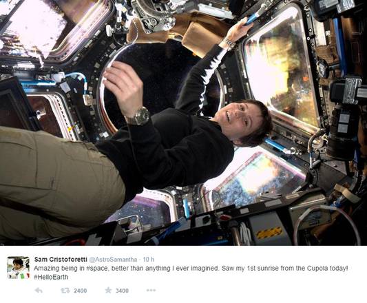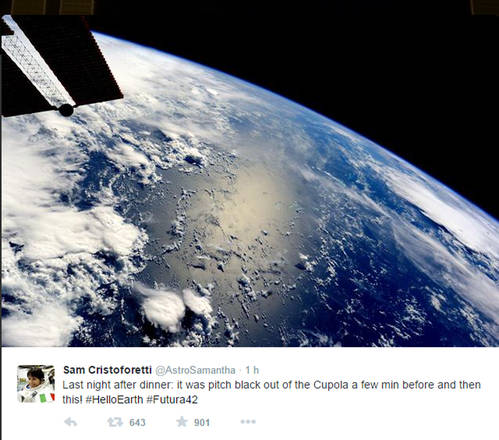 Nel diario scrive che le sembra di essere arrivata sulla stazione orbitante molto tempo fa, ma proprio quando urta contro qualcosa ”per l’abilità di volo da principiante” oppure ogni volta che ha bisogno di fare una domanda le torna in mente che è appena arrivata e ha ancora molto da imparare. ”Quando la vostra mente sta assorbendo così tante esperienze e informazioni – scrive l’astronauta dell’Agenzia Spaziale Europea – si ha la sensazione che il tempo si espanda. Il lancio sembra già così lontano”. Sul programma del primo giorno, sottolinea che ”per lo più, ho fatto del lavoro preparatorio per alcuni dei prossimi esperimenti”. In sé stesso, scrive, ”è un compito semplice, ma molto impegnativo quando siete appena arrivati nello spazio e non avete ancora il perfetto controllo del vostro corpo, senza contare cinque grandi borse che dovete in qualche modo maneggiare mentre accedete a un determinato armadietto”. Inoltre ha studiato un po’ per far funzionare la stampante 3D, con la quale spera di lavorare presto. Stamattina l’astronauta ha inviato anche una nuova foto della Terra via Twitter, scrivendo ”il mondo fuori dalla nostra finestra. Finora ogni volta che ho guardato giù ho visto solo oceani”.