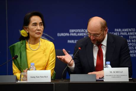 epa03918942 Martin Schulz (R), President of the European parliament, and Myanmar opposition leader Aung San Suu Kyi (L) deliver a press conference after recieving the Sakharov Prize for Freedom at the European Parliament in Strasbourg France, 22 October 2013. The European Parliament awarded the Sakharov Prize to Aung San Suu Kyi in 1990 in recognition of her fight for democracy and the rule of law in Myanmar/Burma, while she was under house arrest. EPA/PATRICK SEEGER