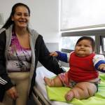Eunice Fandino, left, stands next to her eight-month old son Santiago Mendoza at a clinic in Bogota, Colombia, Tuesday, March 18, 2014. Santiago, Fandino's fifth child, weighs more than 20 kilos and will be on a diet to lose weight, said therapist Salvador Palacios of a nonprofit organization that cares for obese children. (AP Photo/Fernando Vergara)
