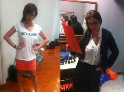 A sinistra, una foto di Sara Tommasi mentre indossa una t-shirt con su scritto "Tutte cagne", a destra una foto che Sara ha postato su Facebook con la scritta "Mille Lire Lap Dance. Pordenone sono pronta..."