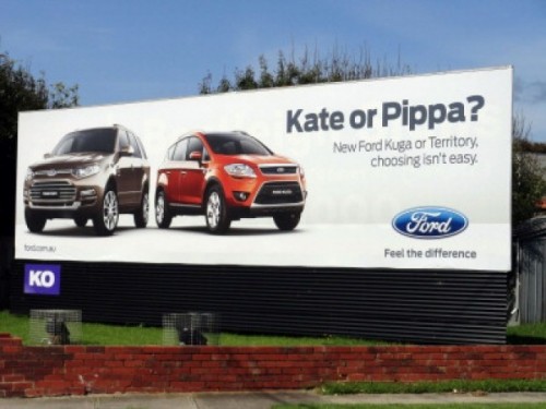 SYDNEY (AUSTRALIA) – In Australia è apparsa questa curiosa pubblicità di due auto della Ford piuttosto simili tra loro. Il paragone è tra le note sorelle Middleton e i due modelli automobilistici prodotti dalla casa automobilistica.