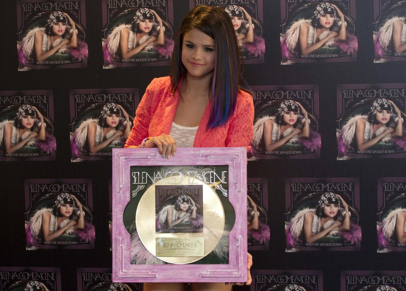 U.S. pop singer Selena Gomez holds a golden record as a recognition for her over 30,000 records sold, as she poses for pictures in Mexico City, Thursday, Jan. 26, 2012. Gomez will perform a show Thursday in Mexico City. (AP Photo/Eduardo Verdugo)