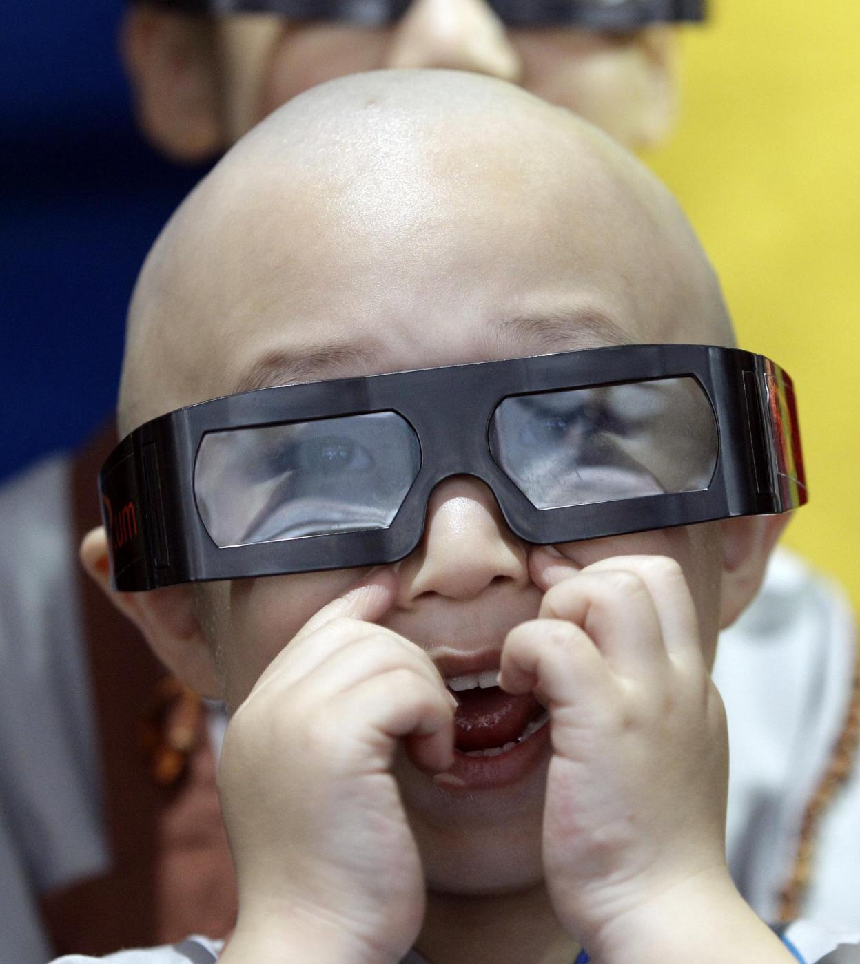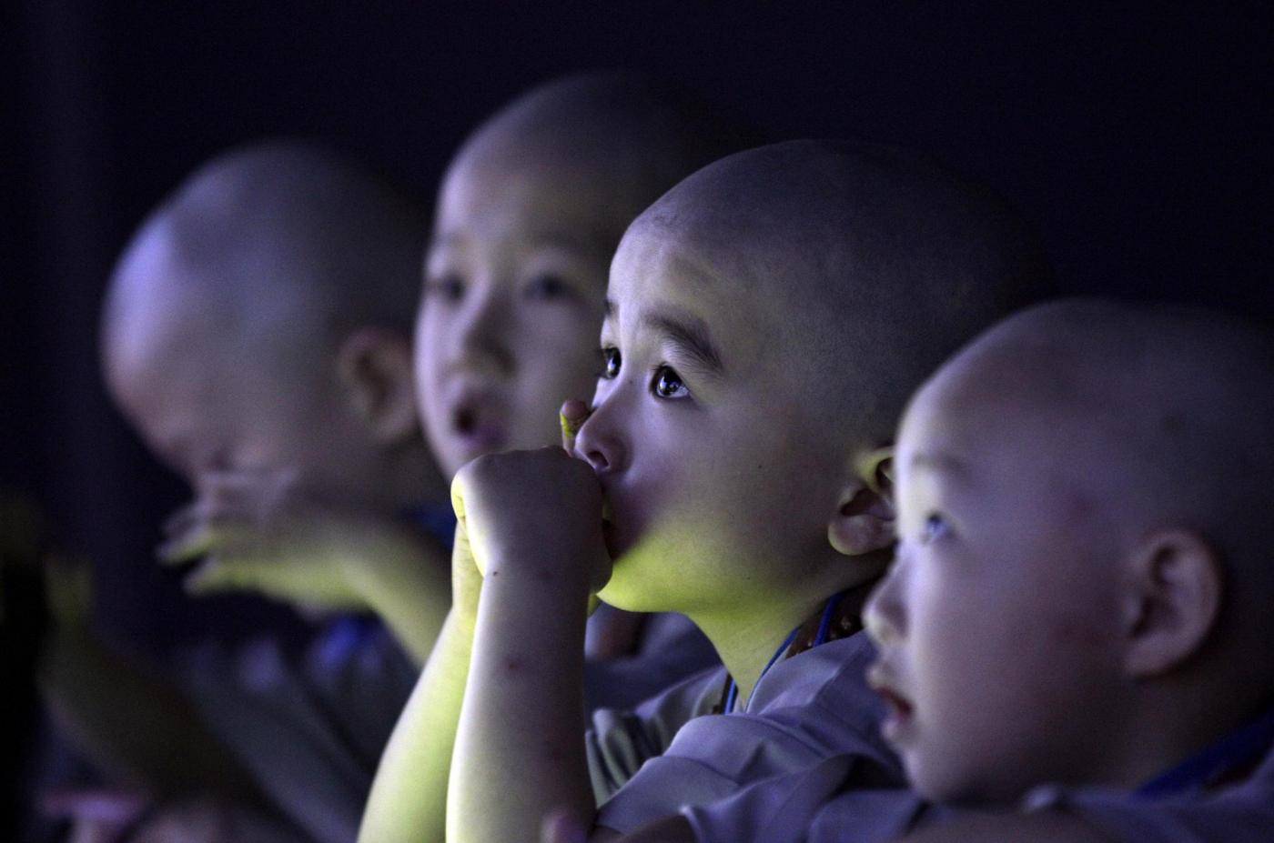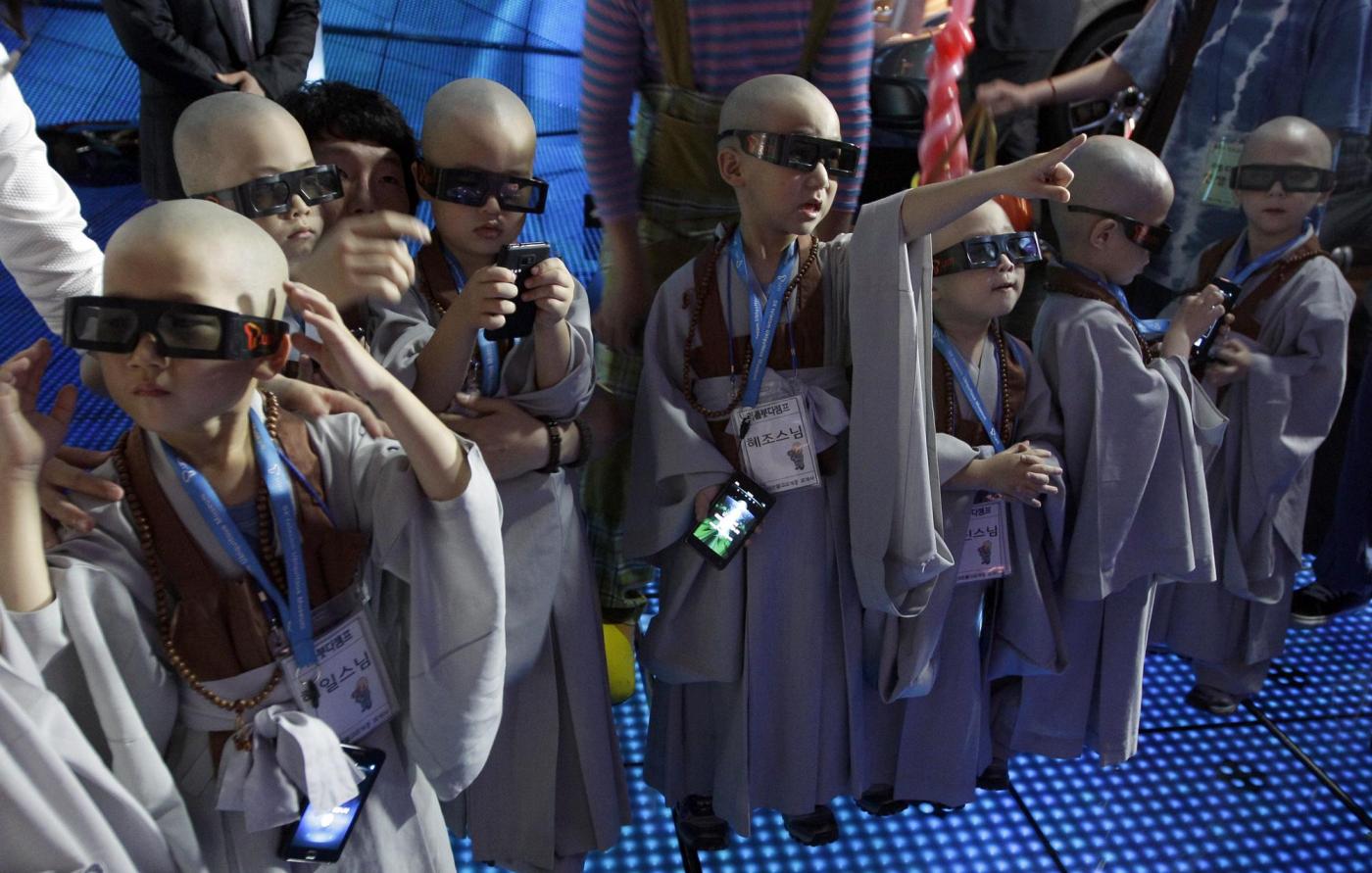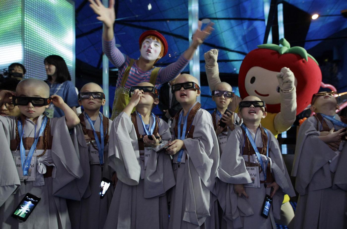 I bambini sono stati scelti per essere iniziati alla religione buddista. La preparazione dura tre settimane e avviene all’interno del tempio di Jogye a Seul. I piccoli vengono rapati a zero e Nelle immagini, i ragazzini indossano occhialini 3D durante una visita al Museo SKTelecom T.um di Seul (foto Ap/LaPresse):