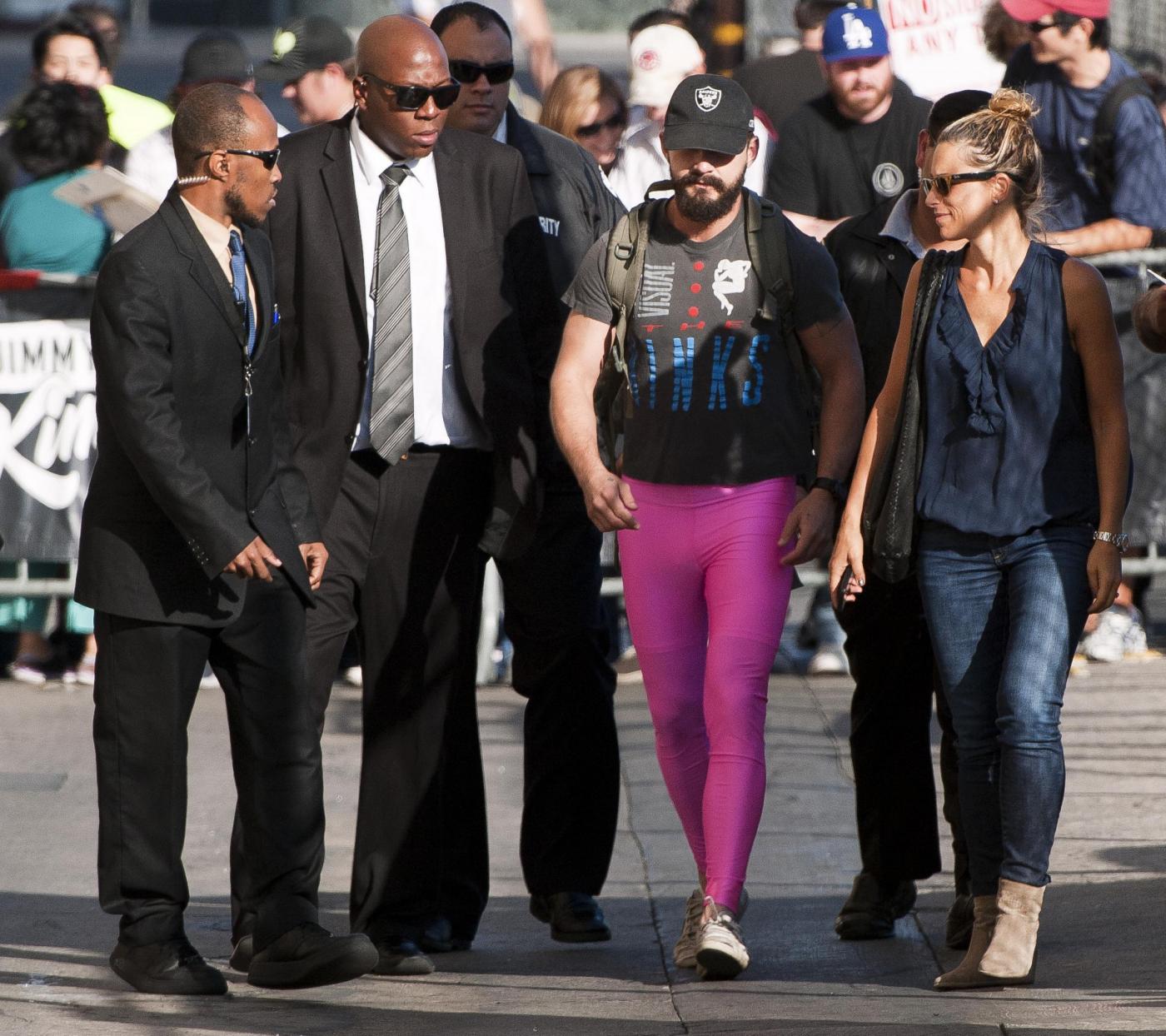 Shia LabeoufOct. 13, 2014 - Hollywood, California, U.S - American actor Shia Labeouf wore pink tights for his appearance on Jimmy Kimmel Live! in Hollywood on Monday October 13, 2014. Labeouf turned around and bent over t before entering the building to show off ''Ellen For The Cure,'' written out in white letters on the seat of the tights.Zuma press/LaPresseOnly Italy