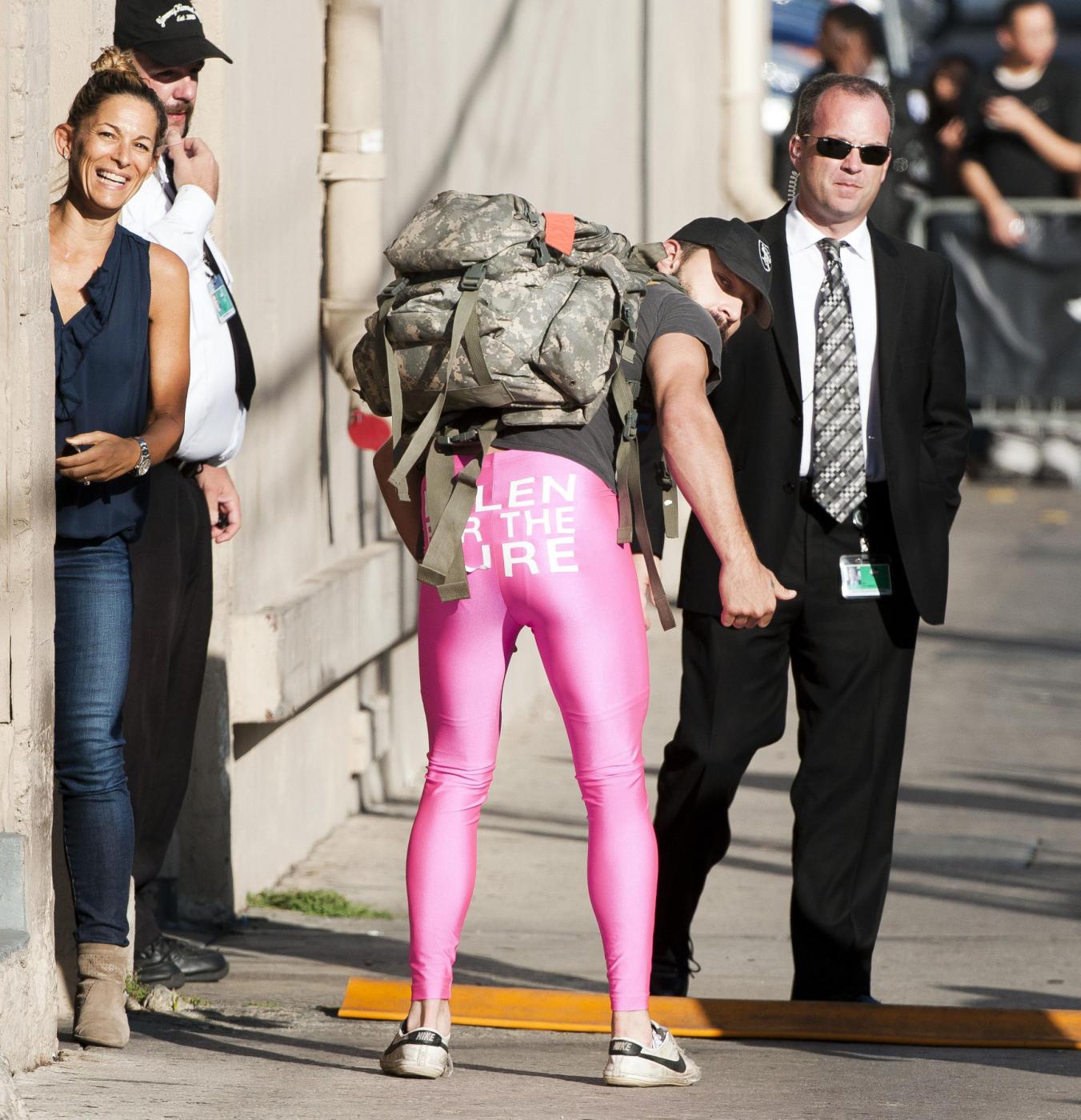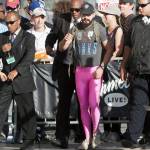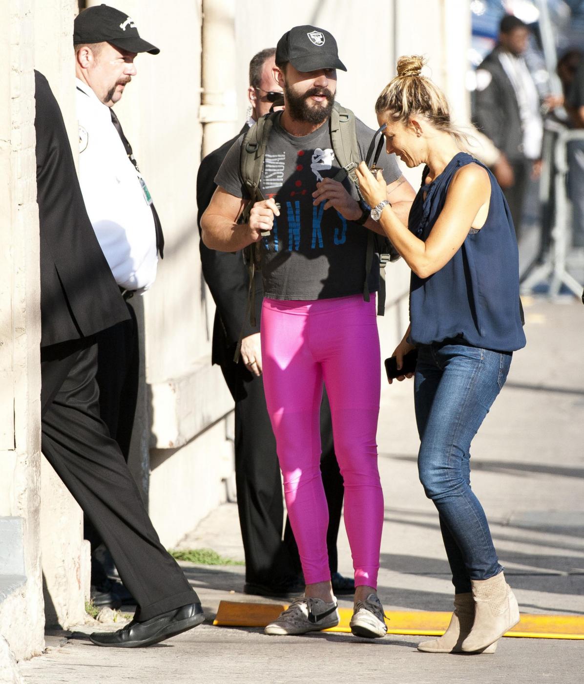 Shia Labeouf Oct. 13, 2014 - Hollywood, California, U.S - American actor Shia Labeouf wore pink tights for his appearance on Jimmy Kimmel Live! in Hollywood on Monday October 13, 2014. Labeouf turned around and bent over t before entering the building to show off ''Ellen For The Cure,'' written out in white letters on the seat of the tights.Zuma press/LaPresseOnly Italy