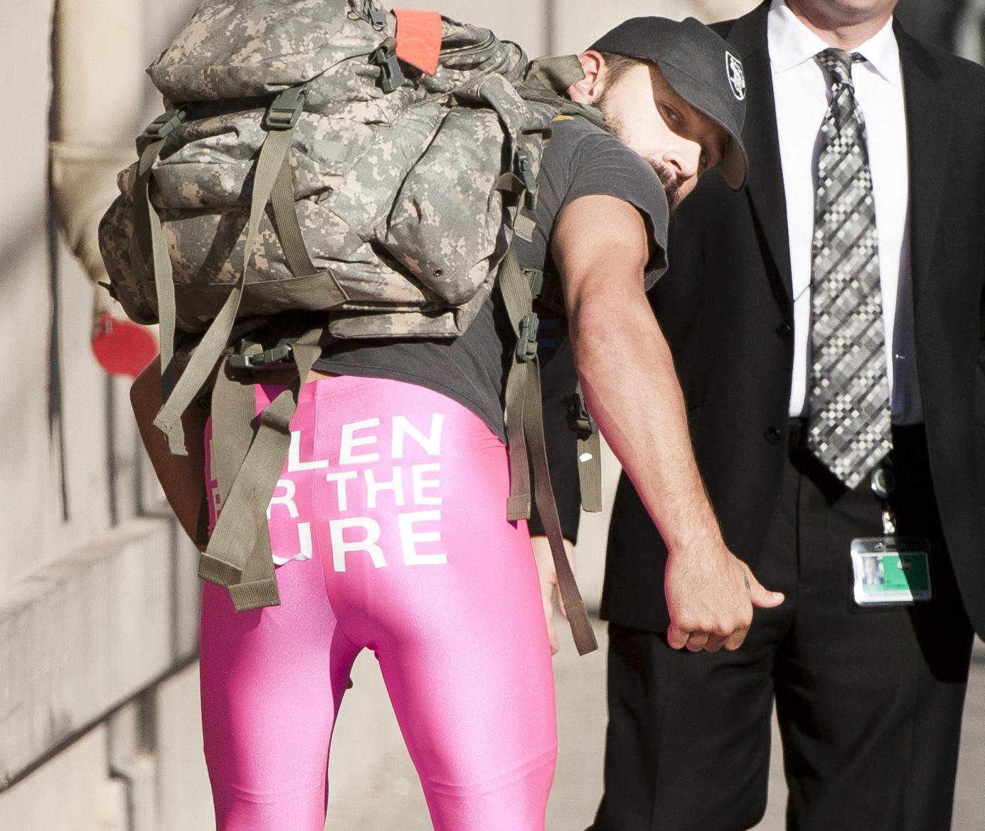 LOS ANGELES (USA) – Shia Labeouf indossa leggins rosa contro il cancro al seno. E’ stato fotografato per le strade di Los Angeles con gli aderentissimi pantaloni colorati, eppure sembrava trovarsi decisamente a proprio agio. Non si tratta però dell’ultima trovata per attirare l’attenzione dei fotografi, come ha già fatto in passato. Il messaggio scritto sul suo fondoschiena spiega tutto: “Ellen for the cure“.