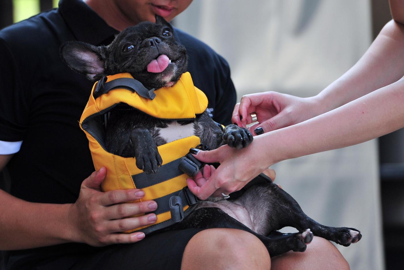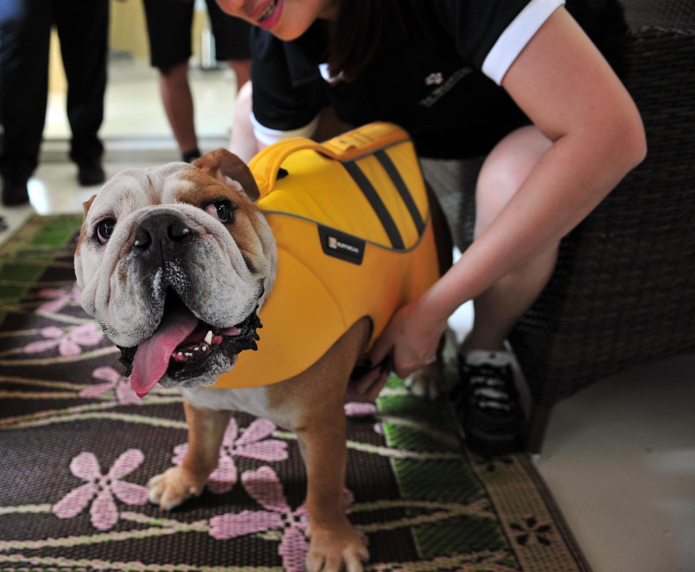 (141104) -- SINGAPORE, Nov. 4, 2014 (Xinhua) -- A hotel staff member helps a dog wear the special life jacket at the luxury pet hotel in Singapore's Dempsey Hill on Nov. 4, 2014. The media preview of Singapore's first luxury pet hotel was held on Tuesday. In this hotel, pets can not only enjoy royal suites, but also SPA, hairdressing, swimming and limousine service. (Xinhua/Then Chih Wey) ****Authorized by ytfs****