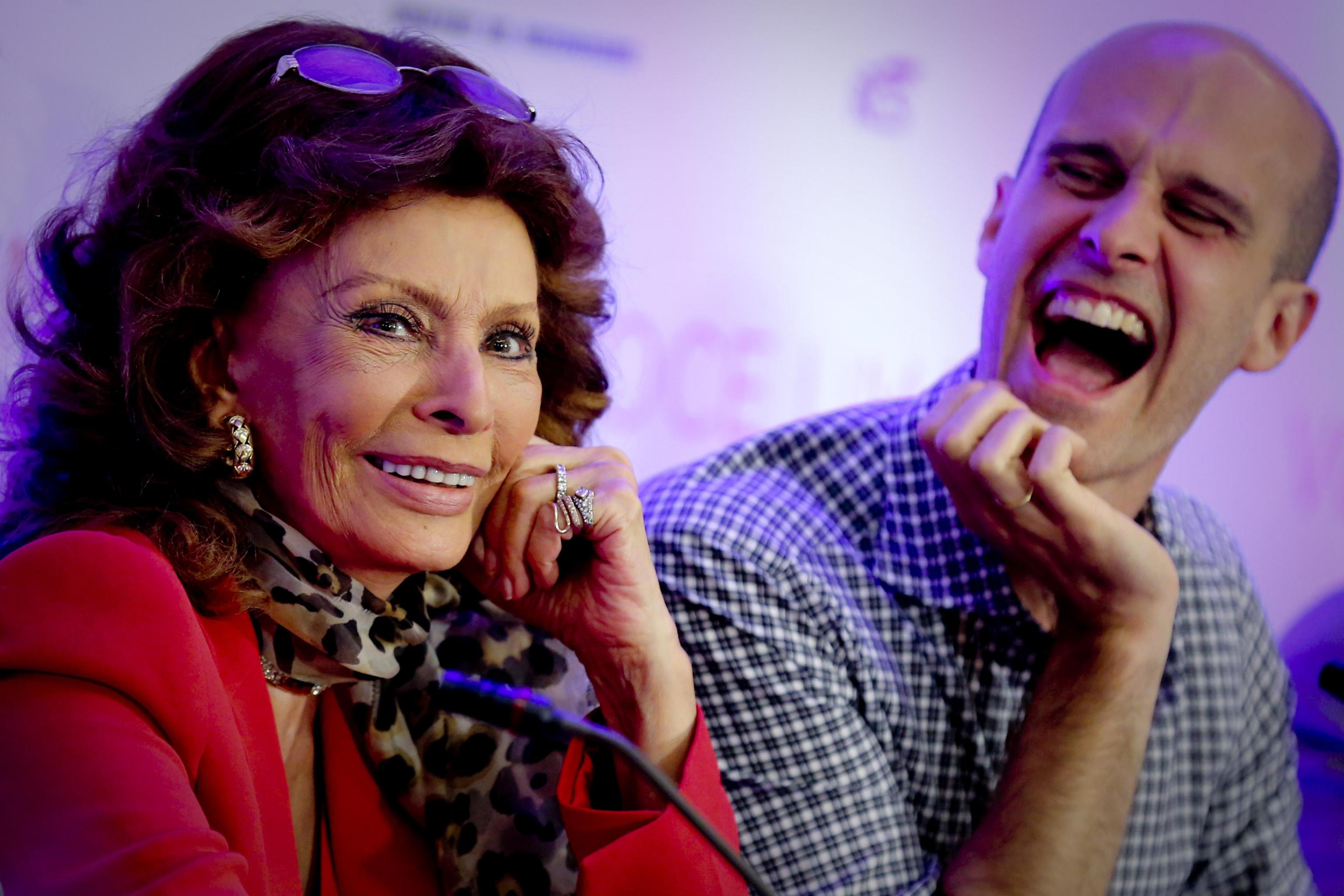Sofia Loren a Napoli per la confernza stampa dell'anteprima italiana de 'La voce umana' diretto dal figlio Eduardo Ponti, 27 maggio 2014. ANSA / CIRO FUSCO