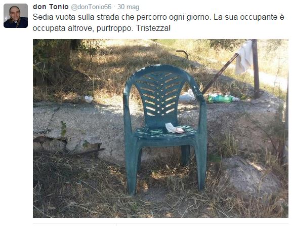 ROMA – Prostituzione di strada, solitudine di una vita trascorsa tra sedia e cliente. Don Tonio, parroco dell’Immacolata di Adelfia (Bari), ha pubblicato sul suo profilo Instagram una foto da lui stesso scattata. Si tratta di una sedia di plastica vuota, lasciata incustodita da una prostituta impegnata con un cliente. Uno scenario che il sacerdote si trova davanti ogni giorno nel suo cammino. “La sua occupante è occupata altrove, purtroppo. Tristezza!”, commenta Don Tonio con i suoi numerosi follower (oltre 25mila).