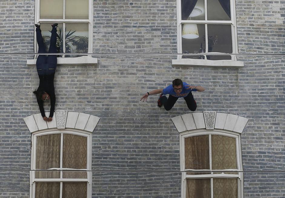 Si tratta di una riproduzione della facciata di una casa vittoriana, vista in orizzontale. Davanti, in verticale, è stato installato un enorme specchio che, grazie a una perfetta illusione ottica, mostra delle persone che sembrano camminare sulla facciata della casa. Grazie allo specchio, la loro immagine riflessa li mostra sospesi in aria (foto LaPresse/Ap)