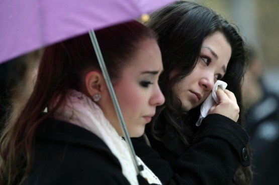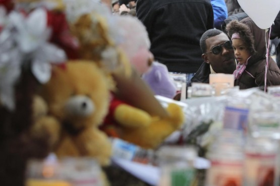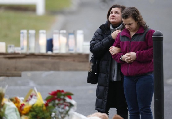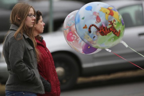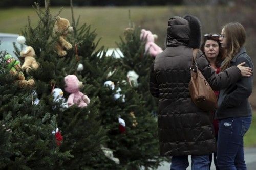 Fuori dalla scuola intanto, continuano ad essere depositati mazzi di fiori, preghiere e orsacchiotti. In tantissimi hanno voleuto rendere omaggio così ai bambini uccisi nella scuola (foto Ap/LaPresse):