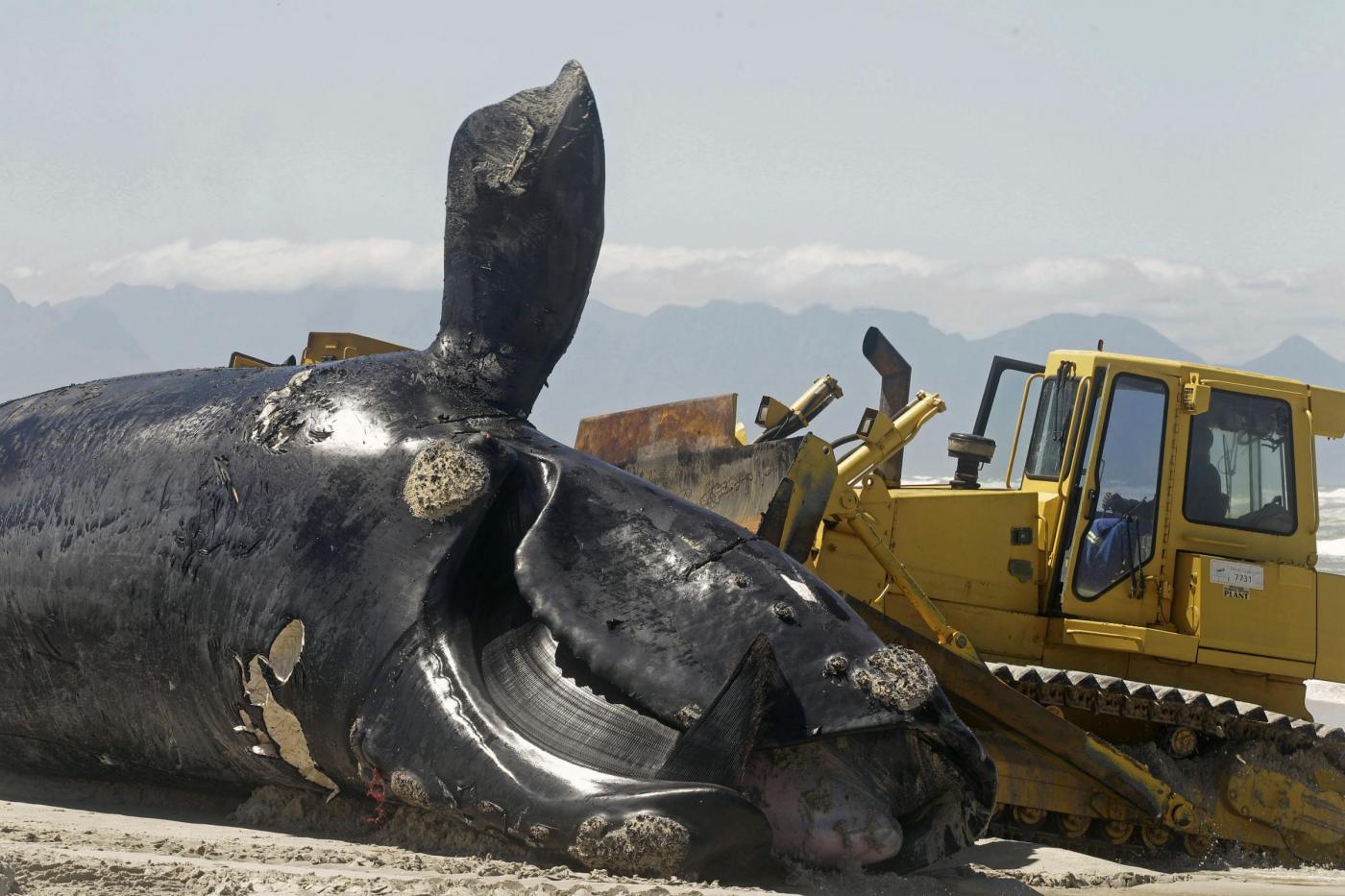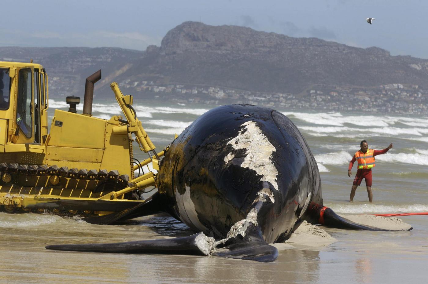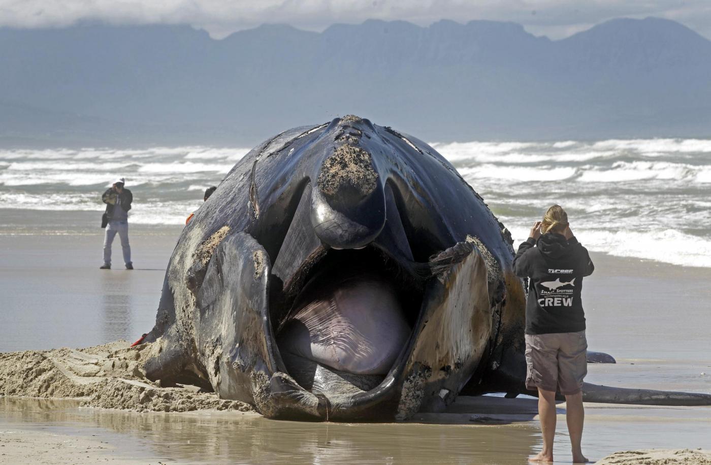 CITTA’ DEL CAPO (SUDAFRICA) – Nella spiaggia sudafricana di Muizenberg vicino a Città del Capo, è apparsa una carcassa di balena lunga 15 metri. Probabilmente, dopo aver subito l’attacco da parte di grandi squali bianchi, il mammifero è morto e la corrente ha portato a riva la carcassa.