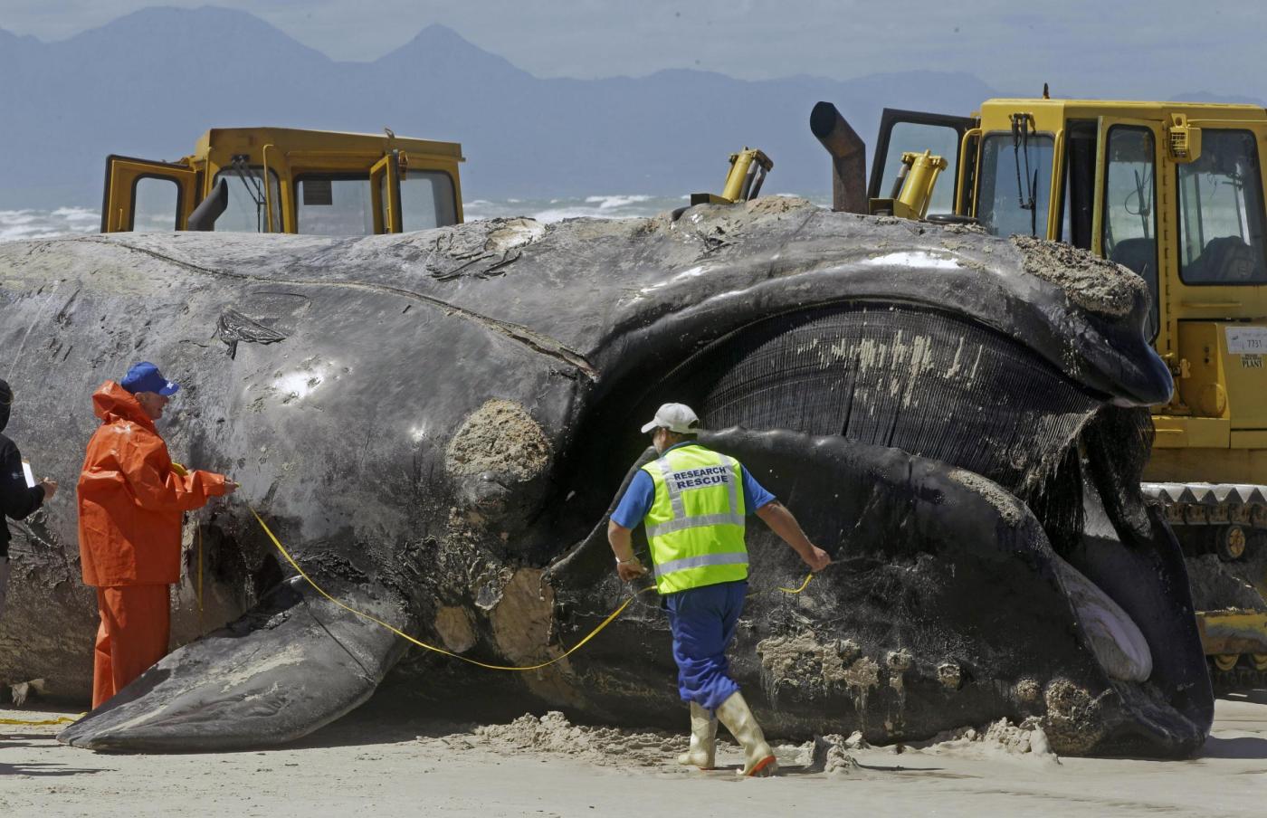 Workers measure a beached Southern right whale carcass washed up on Muizenberg beach on the outskirts of Cape Town, South Africa, Monday, Oct 8, 2012. Beaches remained closed on Monday as disaster response teams attempted to recover the carcass of a whale, as shark activity increasing and the public were warned not to enter the water. (AP Photo/Schalk van Zuydam)