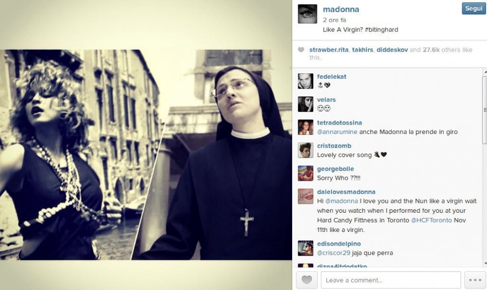 ROMA – Due combo sui suoi profili social e due brevi commenti. L’interpretazione di Like a Virgin di Suor Cristina non è passata inosservata neanche a Madonna. “Like A Virgin? #bitinghard”, scrive Lady Ciccone sul suo profilo Facebook ufficiale a corredo di una immagine doppia in cui da una parte c’è lei, giovane, nel video della canzone e dall’altra c’è Suor Cristina, anche lei impegnata a cantare la hit di Madonna.
