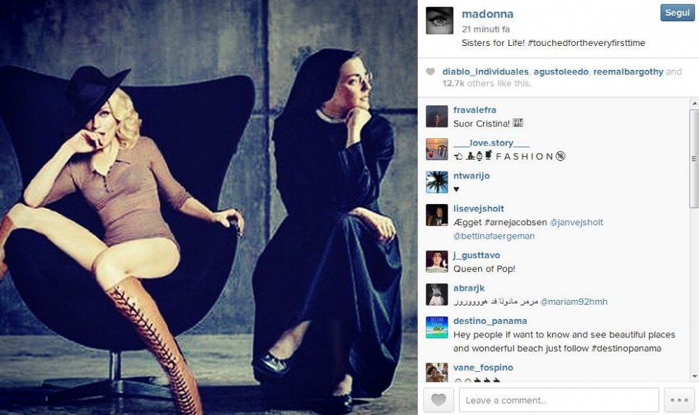 Un messaggio ironico (bitinghard significa nello slang americano ‘copiando forte’), con cui la star di origini italiane dice la sua sulla collega italiana. Poi una seconda foto con Madonna seduta in posa sexy e Suor Cristina anche lei seduta accanto e la scritta: ‘Sisters for Life! (Sorelle per la vita!) #touchedfortheveryfirsttime’.