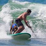 Sept. 28, 2014 - Huntington, CA, US - World Famous Unleashed by Petco Surf City Surf Dog Competition Dogs came from all over the country to compete in the rough waters off Huntington Beach, CA. Some participants came from as far as BRASIL. The beach was crowded with on lookers, dog lovers, and surfers alike. There were multiple categories from small dogs to large..Seen here:.Dog Bono and Ivan Moreira. Lapresse Only italy
