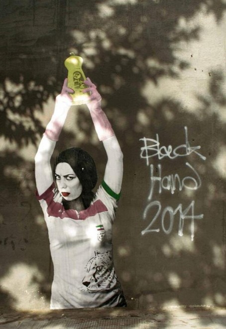 TEHERAN (IRAN) – Sul muro di Vali Asr, una delle strade principali di Teheran, era rappresentato un graffito che raffigura una donna con la maglia della nazionale che alza sulla testa una sorta di Coppa del Mondo che osservando bene, assomiglia in realtà ad una bottiglia di detersivo per piatti. L’autore è Black Hand, il Banksy (famoso artista di strada americano che ora vende le sue opere d’arte per migliaia di dollari) iraniano.