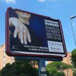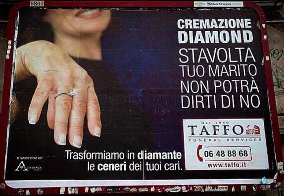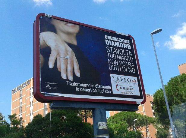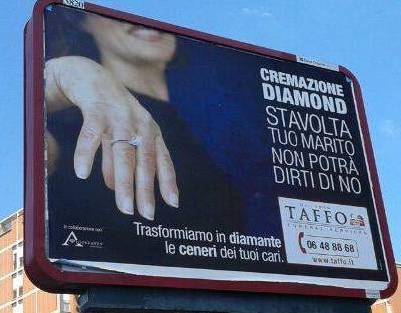 “Questa volta tuo marito non potrà dirti di no” recita il cartellone che sotto, in piccolo, aggiunge “Trasformiamo in diamante le ceneri dei tuoi cari”. Una mano con un bel “brillocco” in primo piano completa la pubblicità.